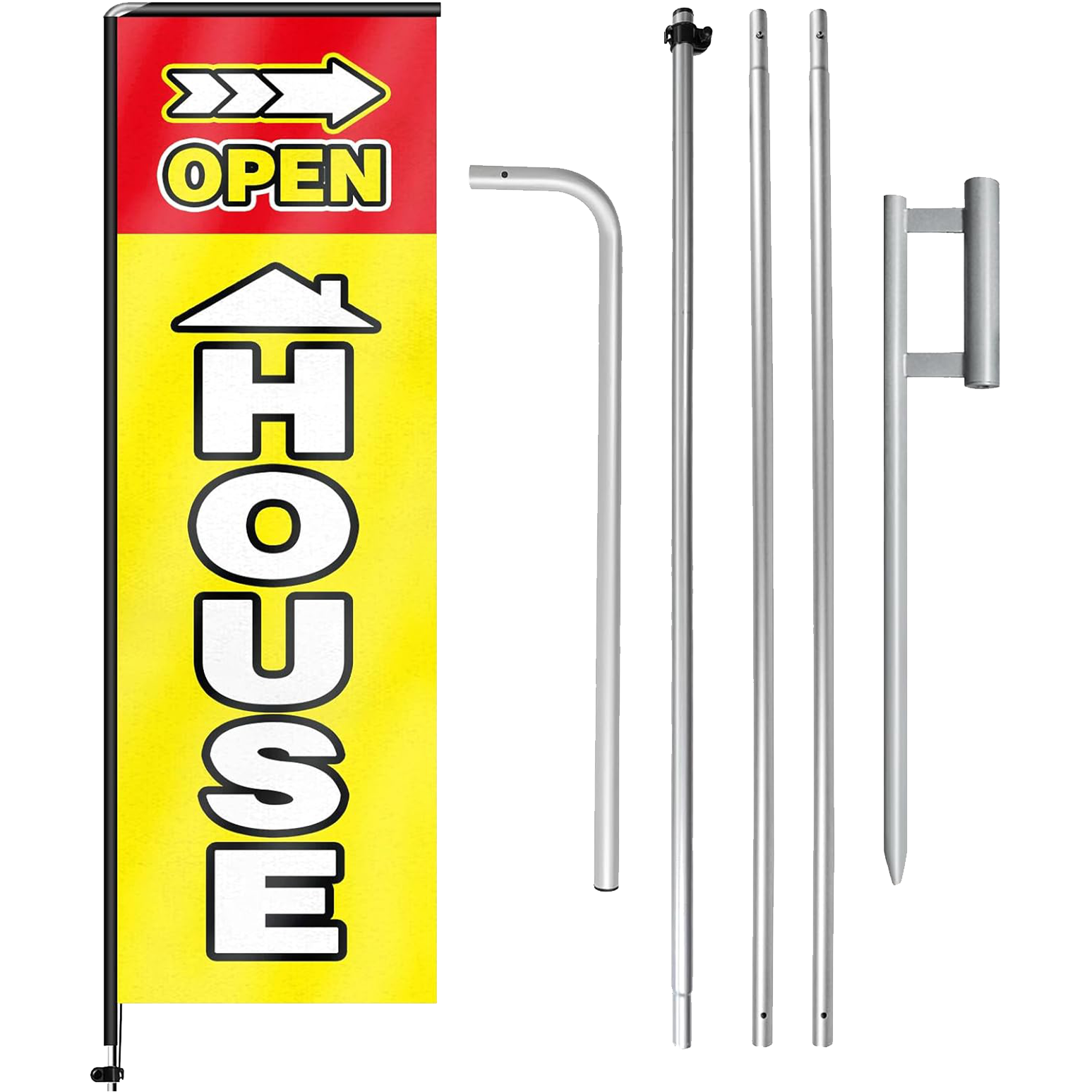 - 【Portable and Easy Setup】This open house feather flag pole kit includes 1 rectangle flag+4 rods+1 ground stake. They can be quickly set up and taken down, requiring minimal effort.