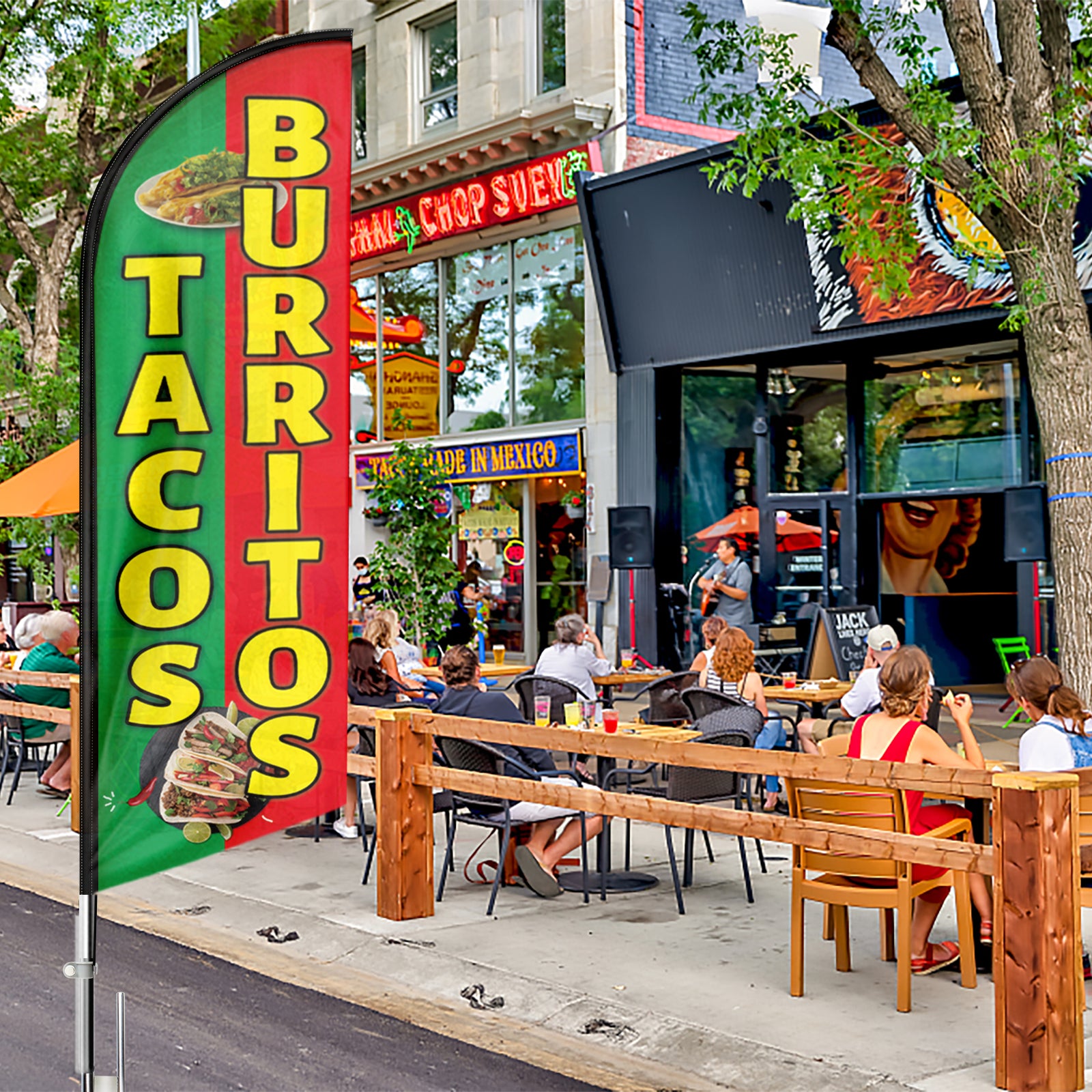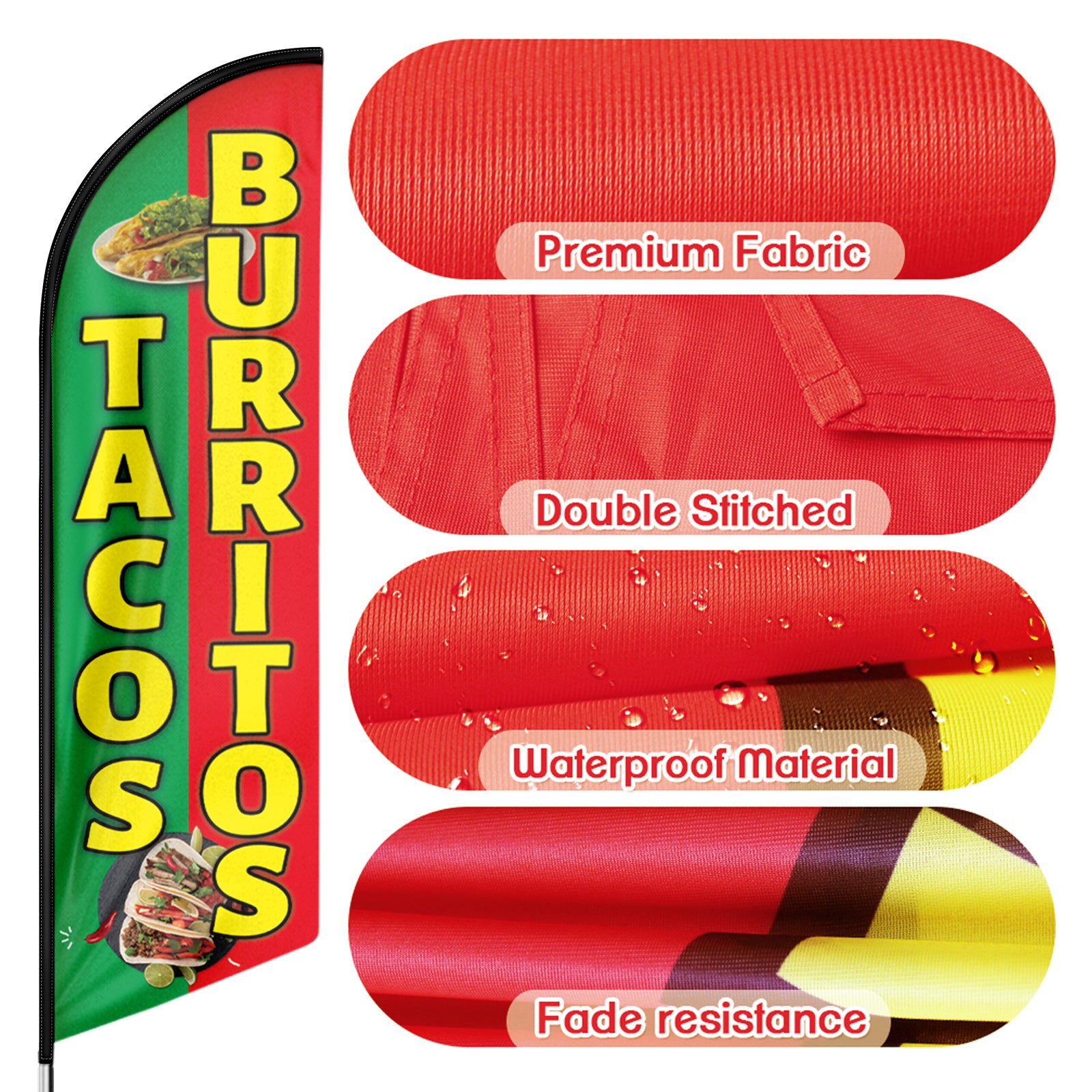 - 🏠【Excellent Advertisement Tool】The Tacos Burritos feather flag size is very large (11ft/ 330cm) tall and (2.1 ft/ 65cm) wide, visible enough from far away, you may put the feather banner up in front of your business, at the entry or on the sidewalk, really a must-have and cost-effective way to increase traffic to business.