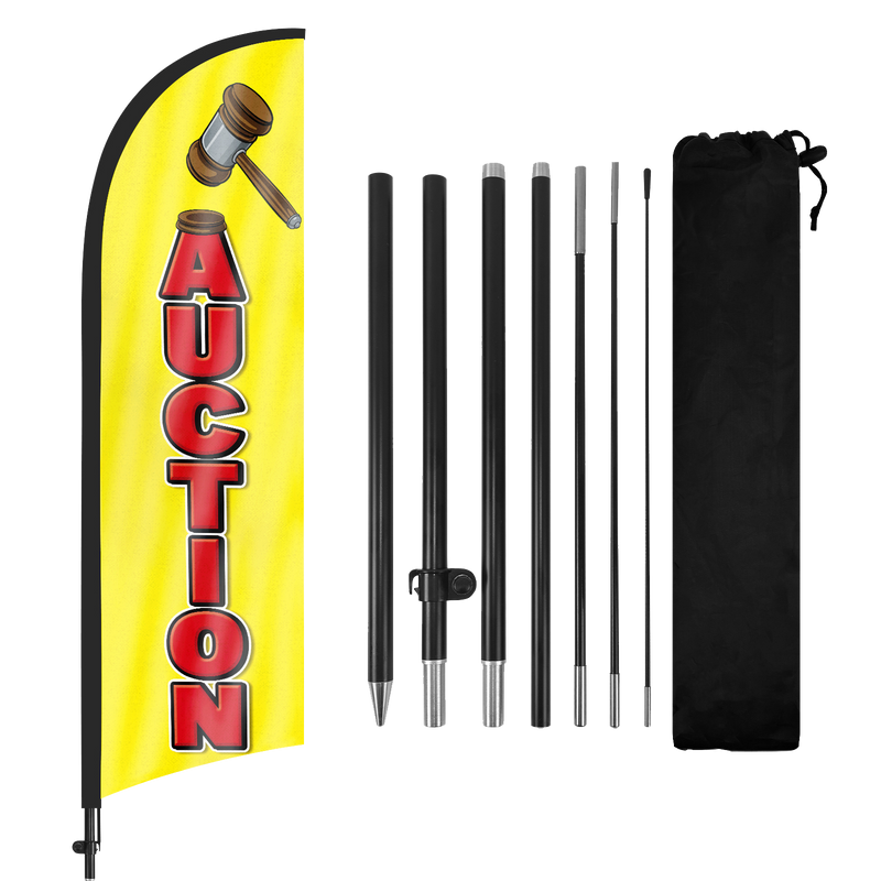 - 【Weather Resistance】These Auction feather flags are designed to withstand various weather conditions, high-quality aluminum and fiberglass pole, tear resistant polyester fabric making it sturdy and heavy-duty to be held up well even in rain, snow, sleet and strong winds.