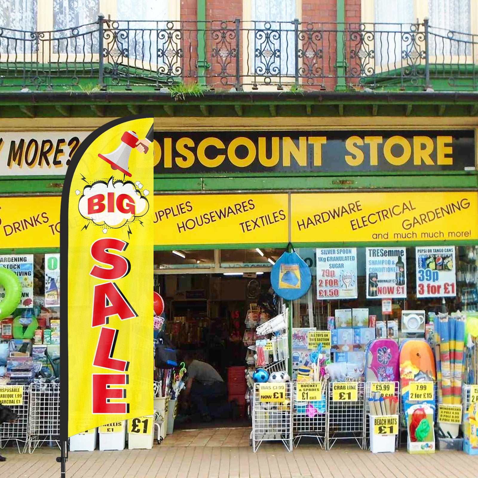 - 【Cost-Effective Advertising】The Big Sale sign offer a cost-effective advertising solution compared to other traditional forms of outdoor advertising. This Big Sale flag size is (8.2ft/98in) tall and (1.8ft/22in) wide, visible enough from far away, ensures your business stands out from the crowd, grabbing attention and increasing foot traffic.