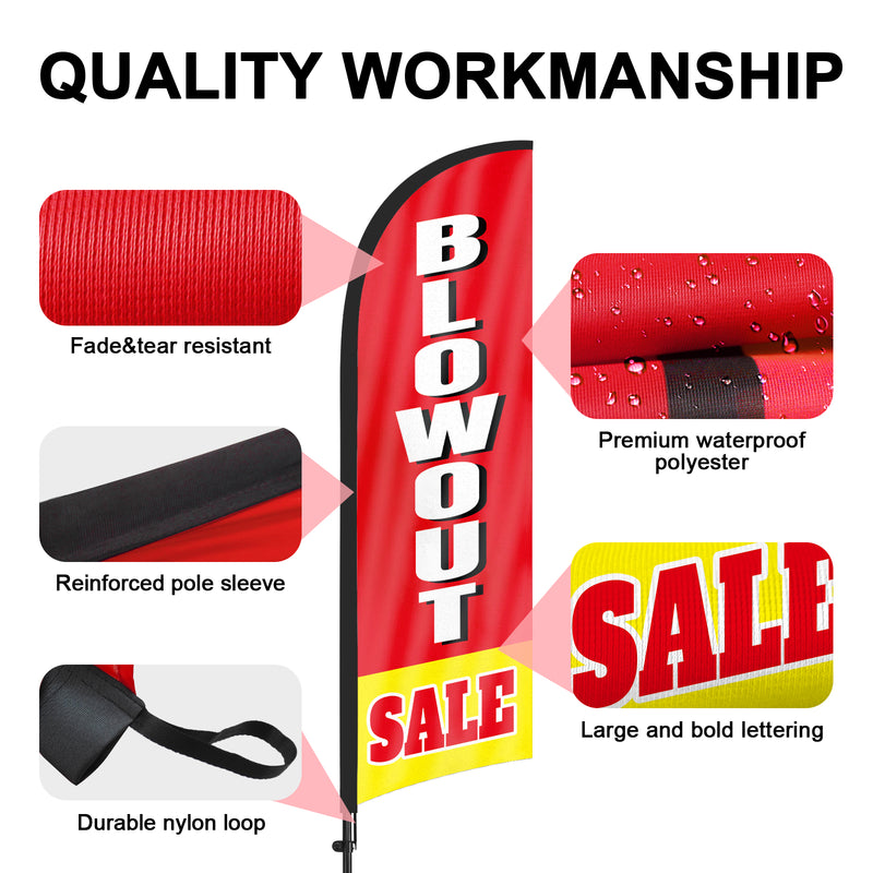 - 【Attention-Grabbing】Blowout Sale feather flags stand tall and sway with the wind, making them highly visible and attention-grabbing. The Blowout Sale flags’ unique shape and vibrant colors make them stand out in crowded environments, attracting many potential customers from a distance.