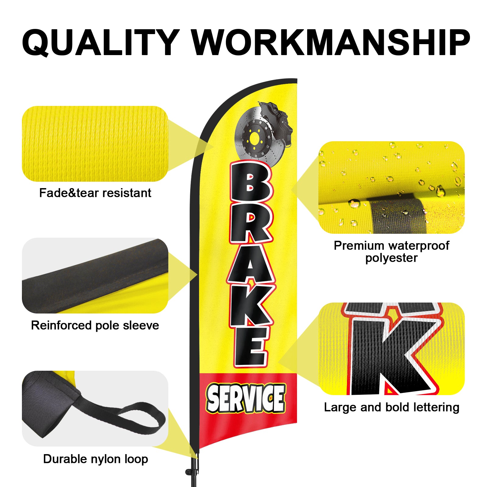 - 【Weather Resistance】These Brake Service feather flags are designed to withstand various weather conditions, high-quality aluminum and fiberglass pole, tear resistant polyester fabric making it sturdy and heavy-duty to be held up well even in rain, snow, sleet and strong winds.