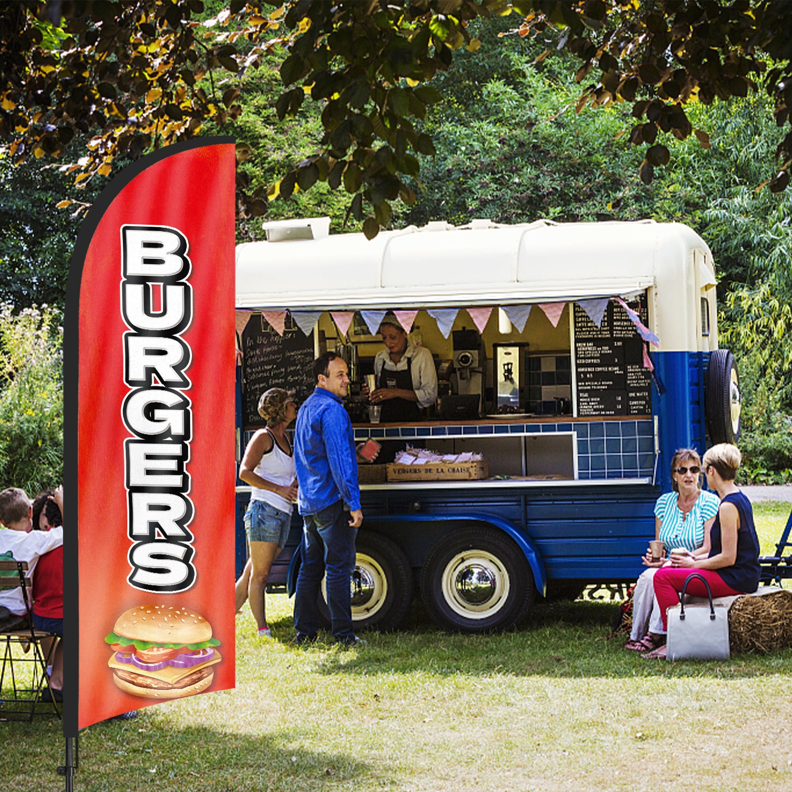 - 【Attention-Grabbing】Burgers feather flags stand tall and sway with the wind, making them highly visible and attention-grabbing. The Burgers flags’ unique shape and vibrant colors make them stand out in crowded environments, attracting many potential customers from a distance.