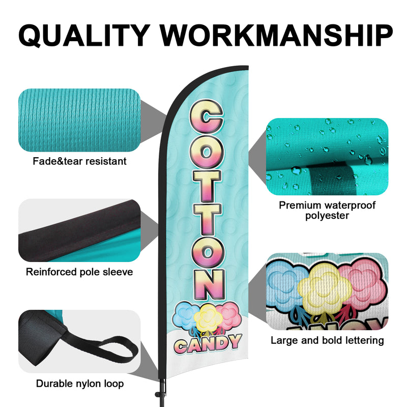 - 【Cost-Effective Advertising】The Cotton Candy sign offer a cost-effective advertising solution compared to other traditional forms of outdoor advertising. This Cotton Candy flag size is (8.2ft/98in) tall and (1.8ft/22in) wide, visible enough from far away, ensures your business stands out from the crowd, grabbing attention and increasing foot traffic.