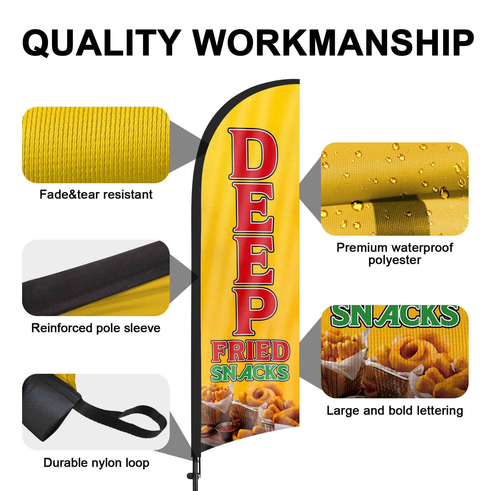 - 【Weather Resistance】These Deep Fried Snacks feather flags are designed to withstand various weather conditions, high-quality aluminum and fiberglass pole, tear resistant polyester fabric making it sturdy and heavy-duty to be held up well even in rain, snow, sleet and strong winds.