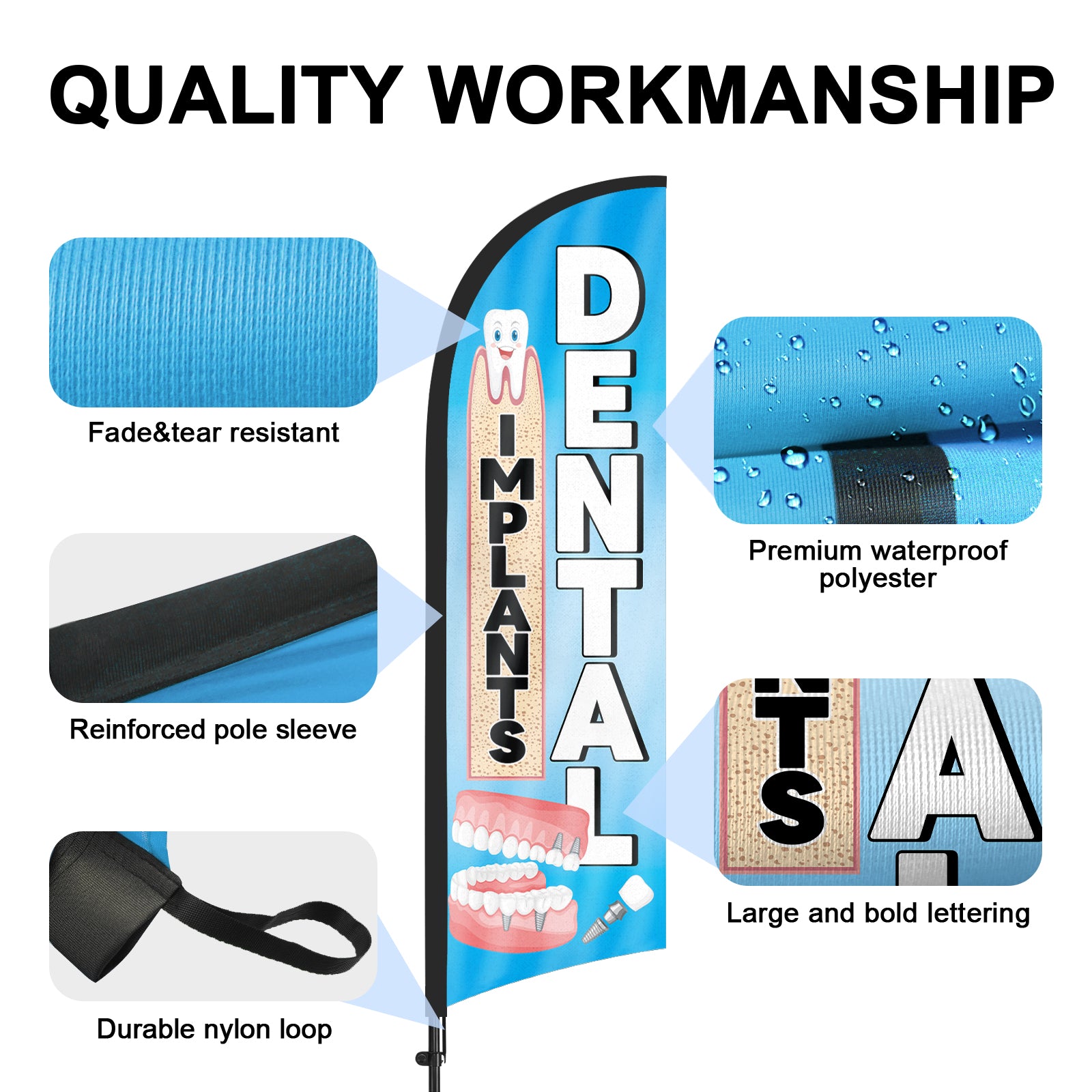 - 【Attention-Grabbing】Dental Implants feather flags stand tall and sway with the wind, making them highly visible and attention-grabbing. The Dental Implants flags’ unique shape and vibrant colors make them stand out in crowded environments, attracting many potential customers from a distance.