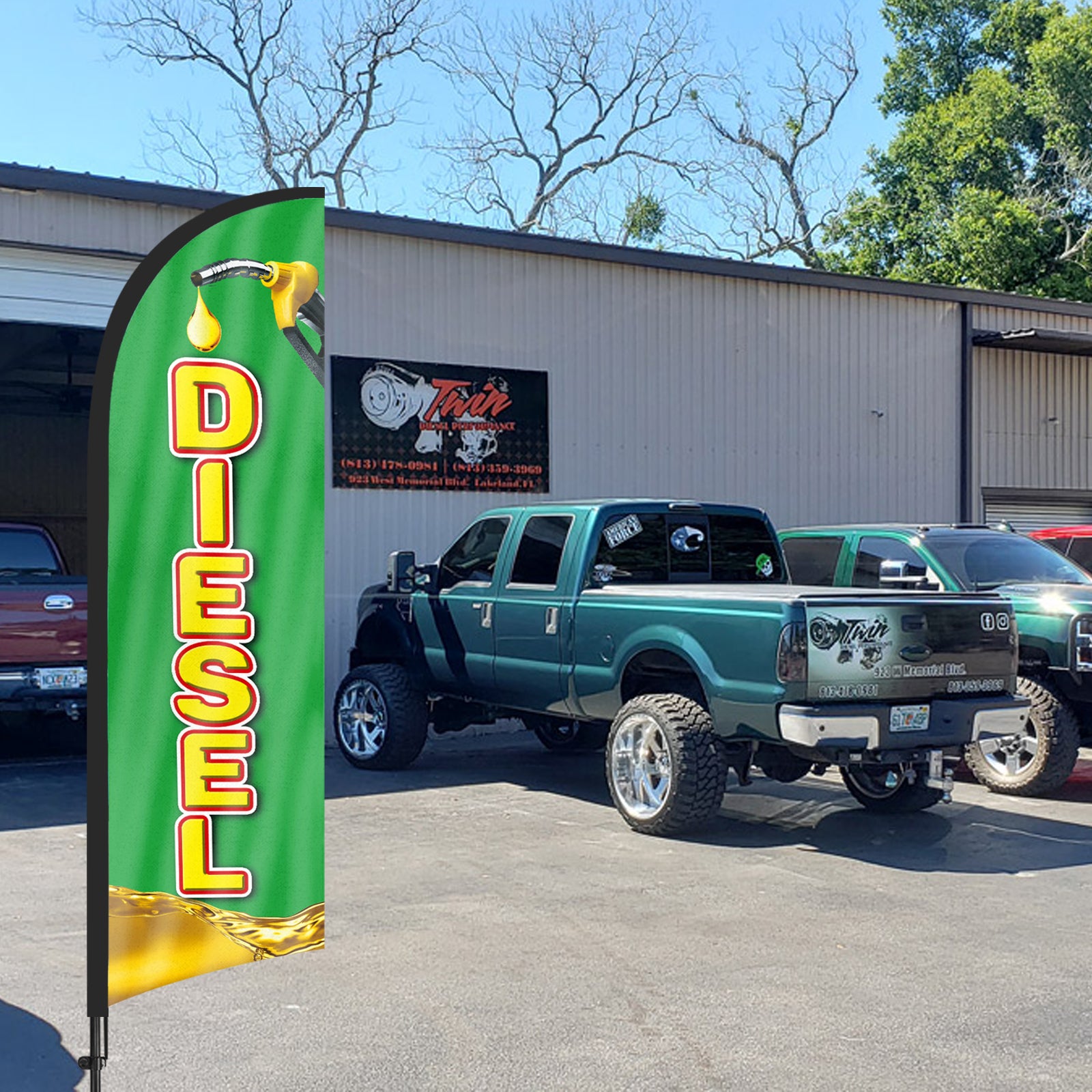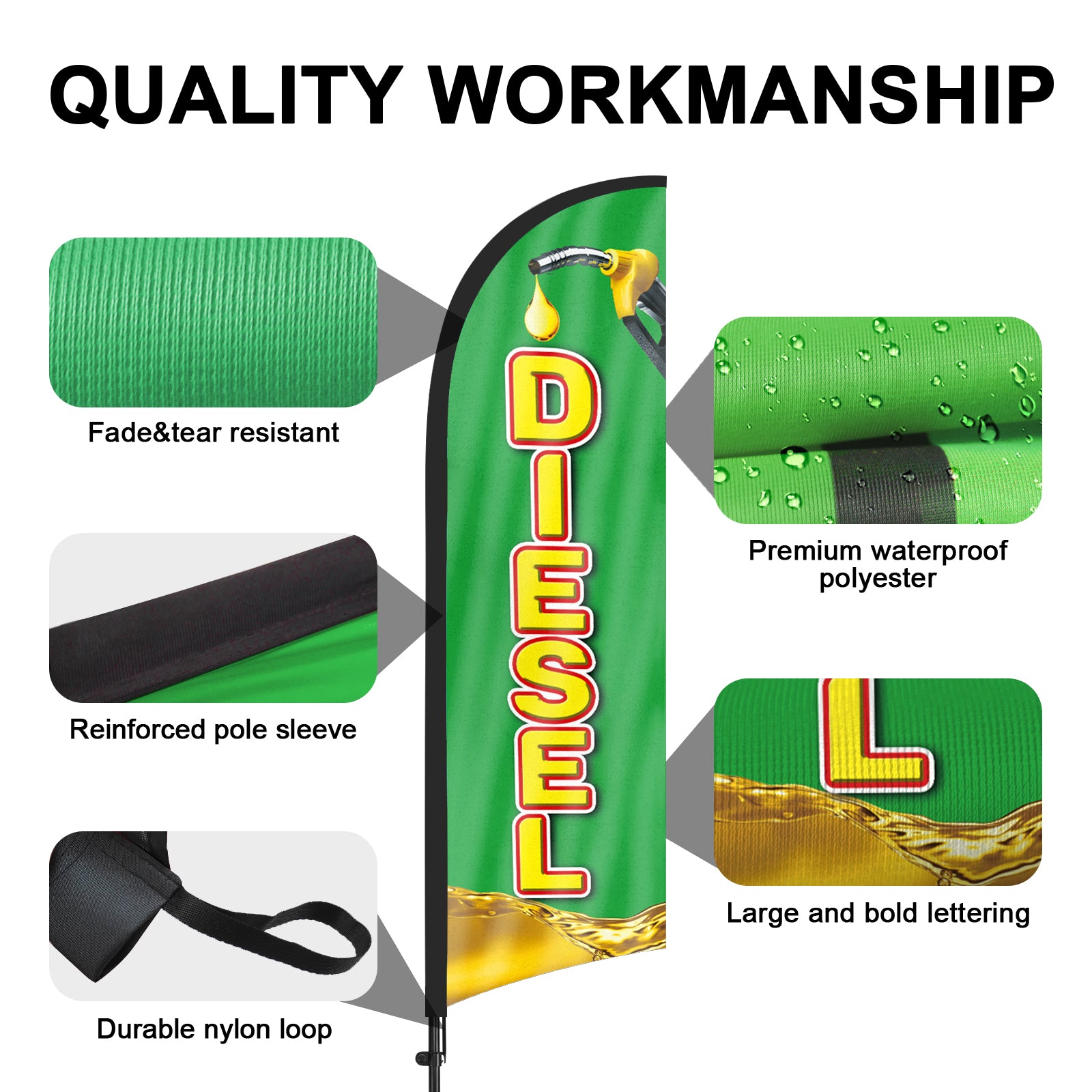 - 【Weather Resistance】These Diesel feather flags are designed to withstand various weather conditions, high-quality aluminum and fiberglass pole, tear resistant polyester fabric making it sturdy and heavy-duty to be held up well even in rain, snow, sleet and strong winds.