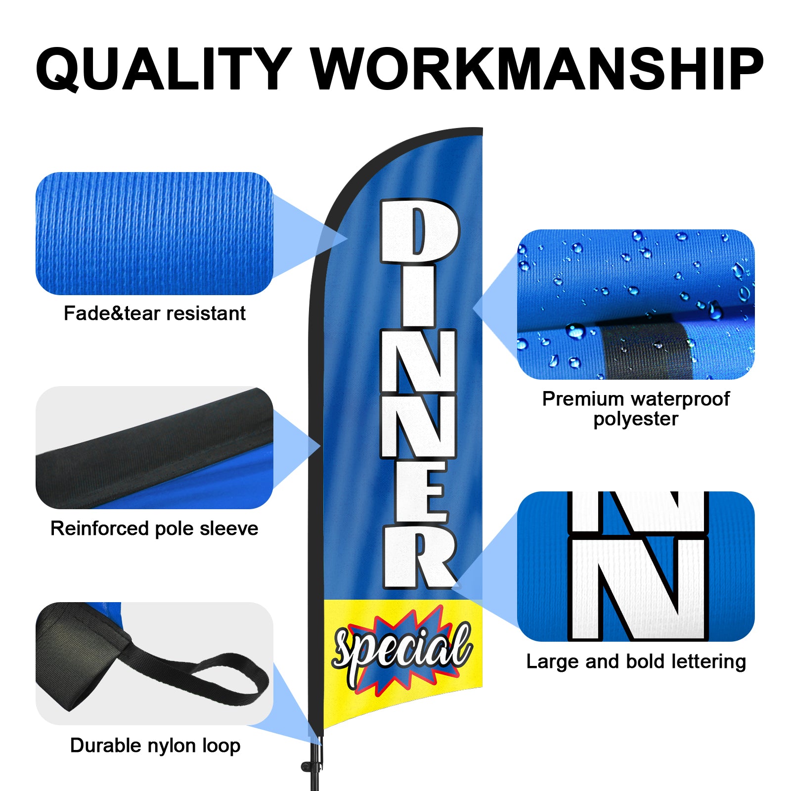 - 【Weather Resistance】These Dinner Special feather flags are designed to withstand various weather conditions, high-quality aluminum and fiberglass pole, tear resistant polyester fabric making it sturdy and heavy-duty to be held up well even in rain, snow, sleet and strong winds.