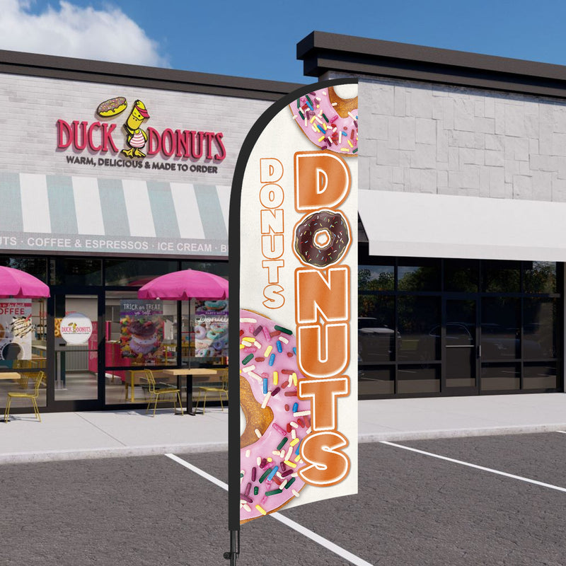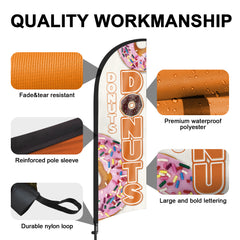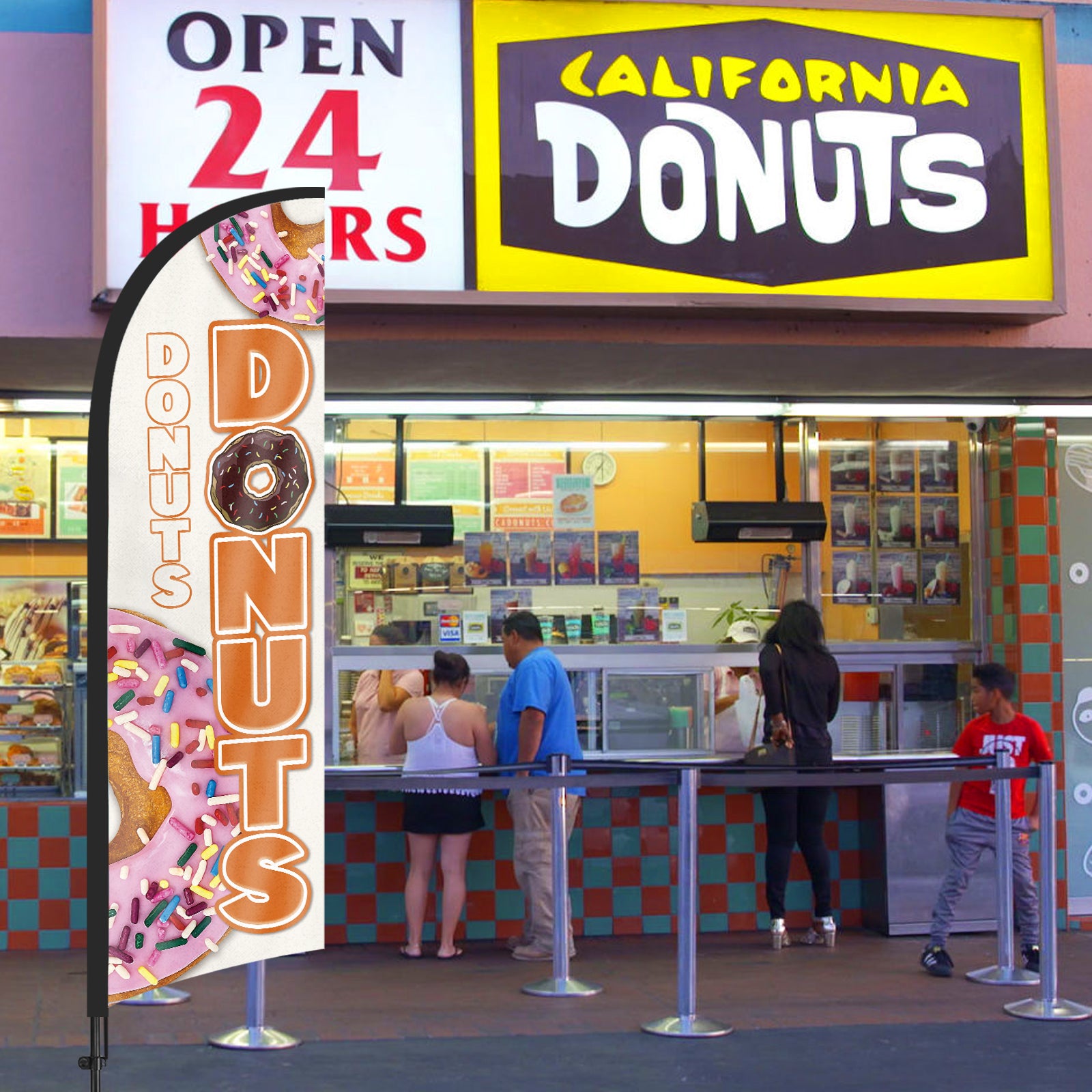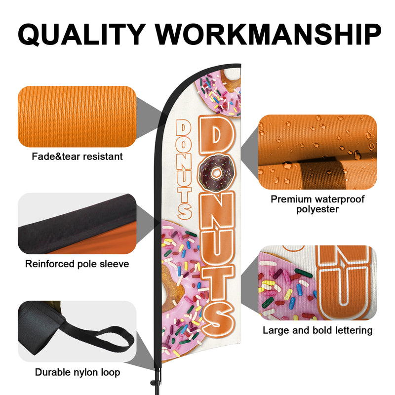 - 【Attention-Grabbing】Donuts feather flags stand tall and sway with the wind, making them highly visible and attention-grabbing. The Donuts flags’ unique shape and vibrant colors make them stand out in crowded environments, attracting many potential customers from a distance.