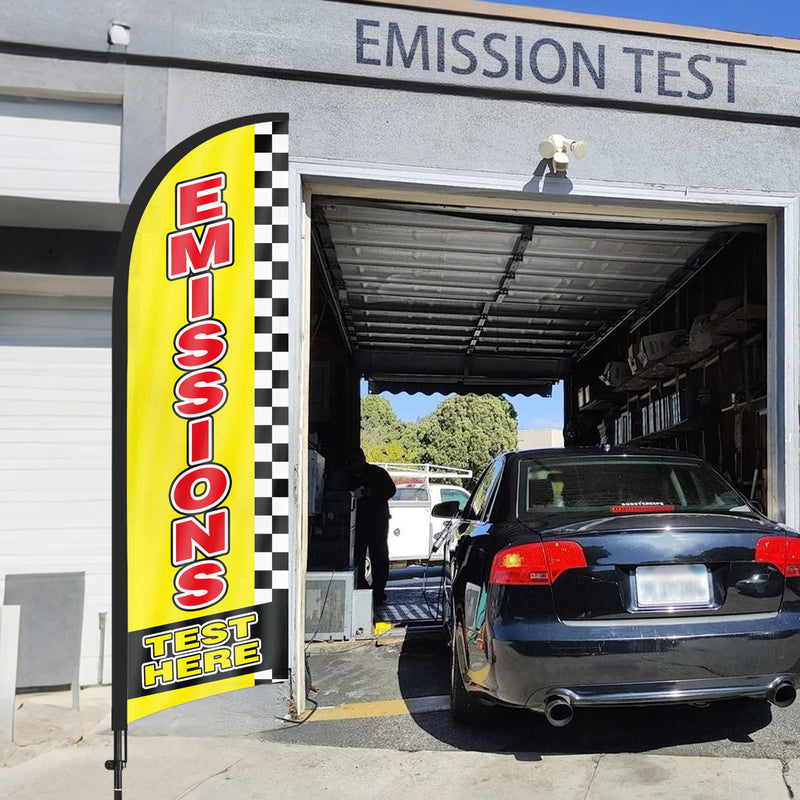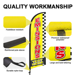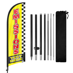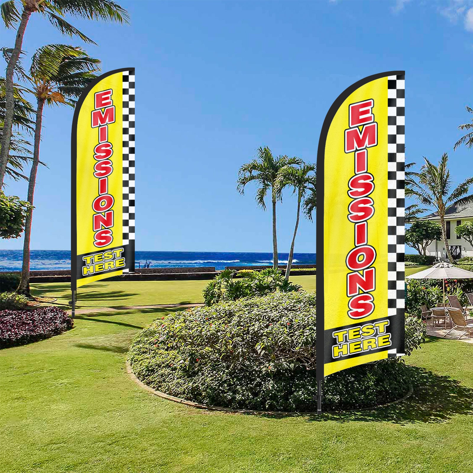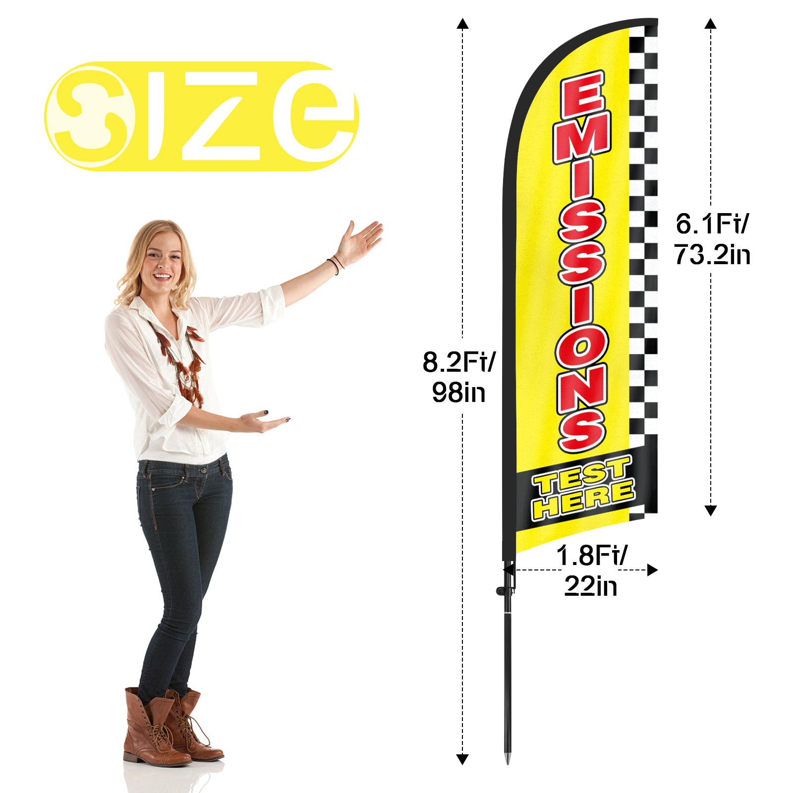 8ft Emissions Test Here Yellow Feather Flag with Pole and Stake