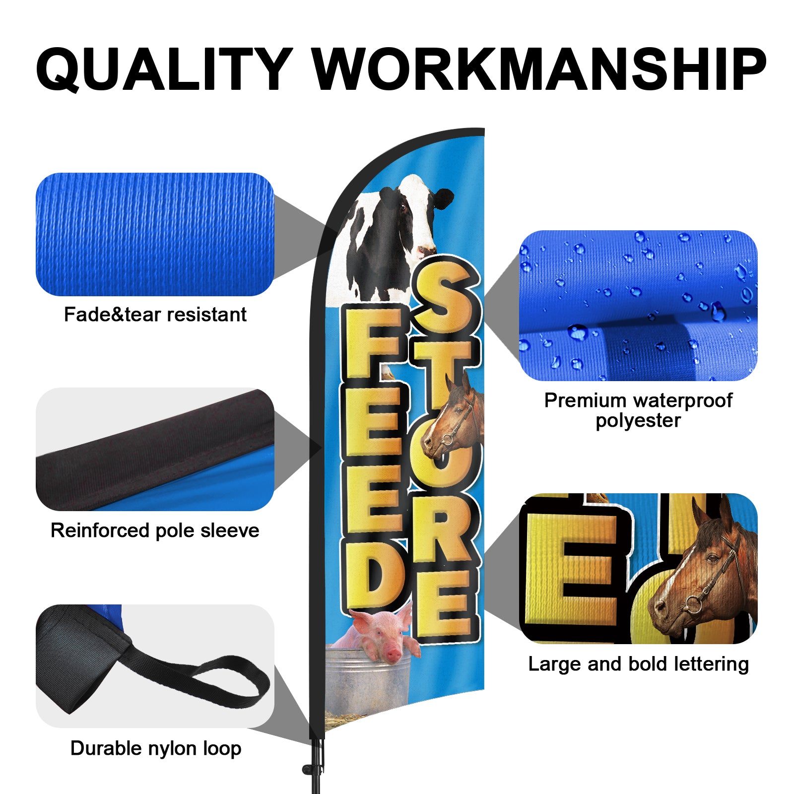 - 【Weather Resistance】These Feed Store feather flags are designed to withstand various weather conditions, high-quality aluminum and fiberglass pole, tear resistant polyester fabric making it sturdy and heavy-duty to be held up well even in rain, snow, sleet and strong winds.