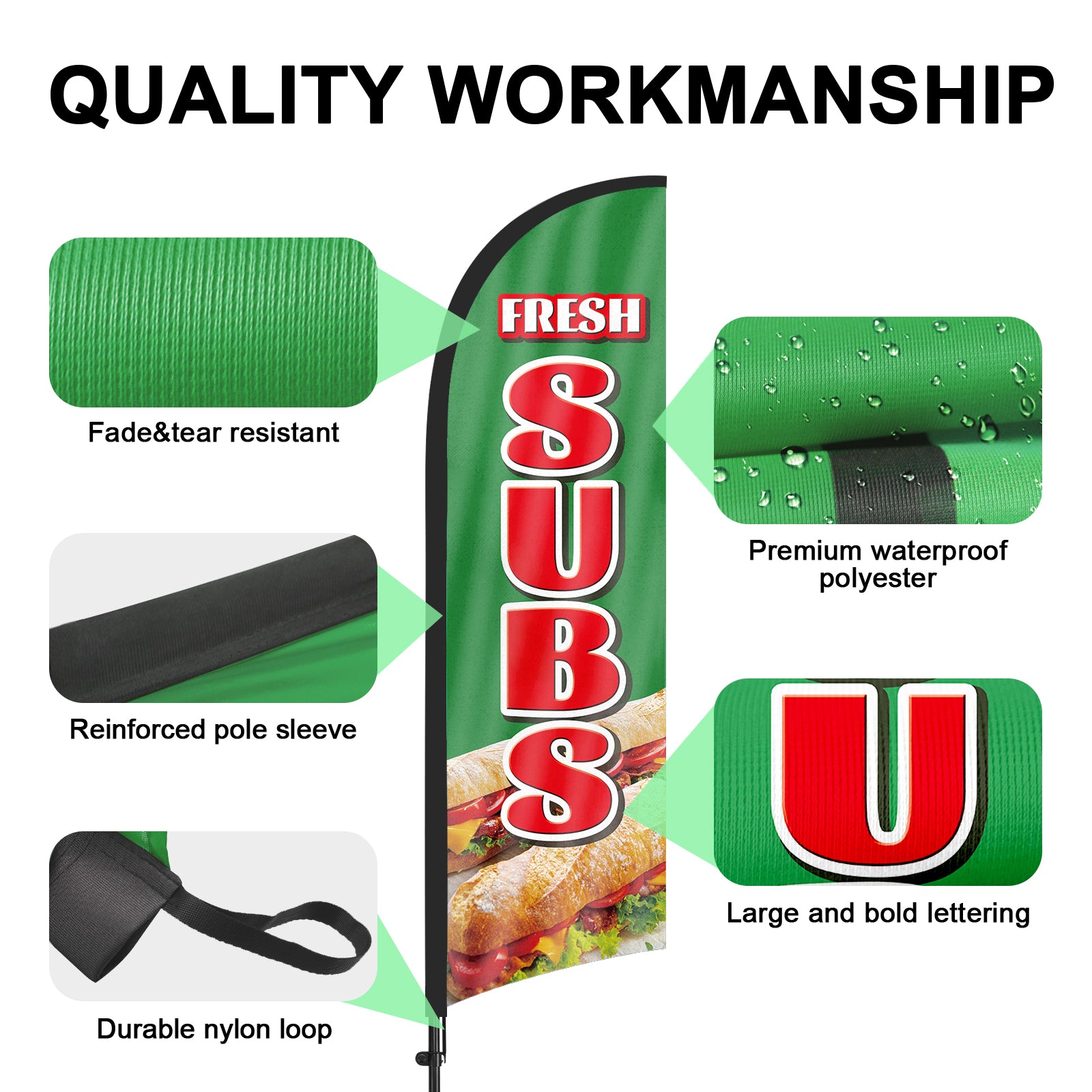 - 【Weather Resistance】These Fresh Subs feather flags are designed to withstand various weather conditions, high-quality aluminum and fiberglass pole, tear resistant polyester fabric making it sturdy and heavy-duty to be held up well even in rain, snow, sleet and strong winds.