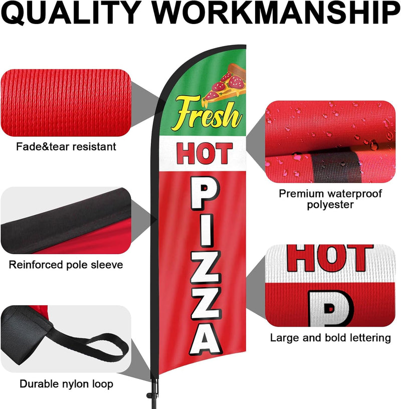 - 【Weather Resistance】These Pizza feather flags are designed to withstand various weather conditions, high-quality aluminum and fiberglass pole, tear resistant polyester fabric making it sturdy and heavy-duty to be held up well even in rain, snow, sleet and strong winds.