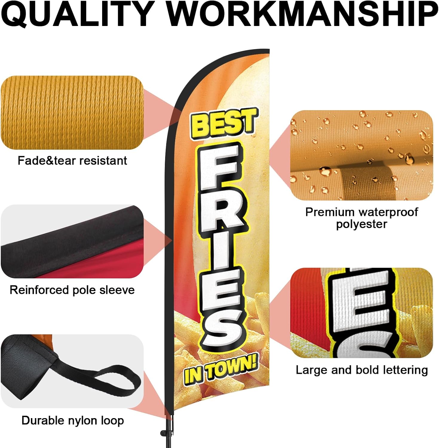 【Weather Resistance】 These Fries feather flags are designed to withstand various weather conditions, high-quality aluminum and fiberglass pole, tear-resistant polyester fabric making it sturdy and heavy-duty to be held up well even in rain, snow, sleet, and strong winds.