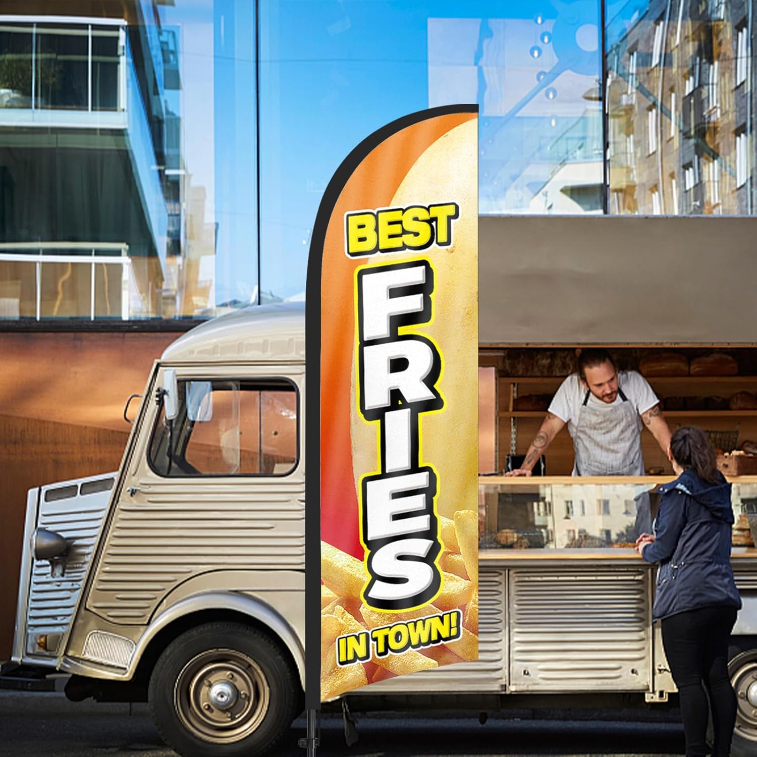 【Attention-Grabbing】 Fries feather flags stand tall and sway with the wind, making them highly visible and attention-grabbing. The unique shape and vibrant colors of flag signs for business make them stand out in crowded environments, attracting many potential customers from a distance.