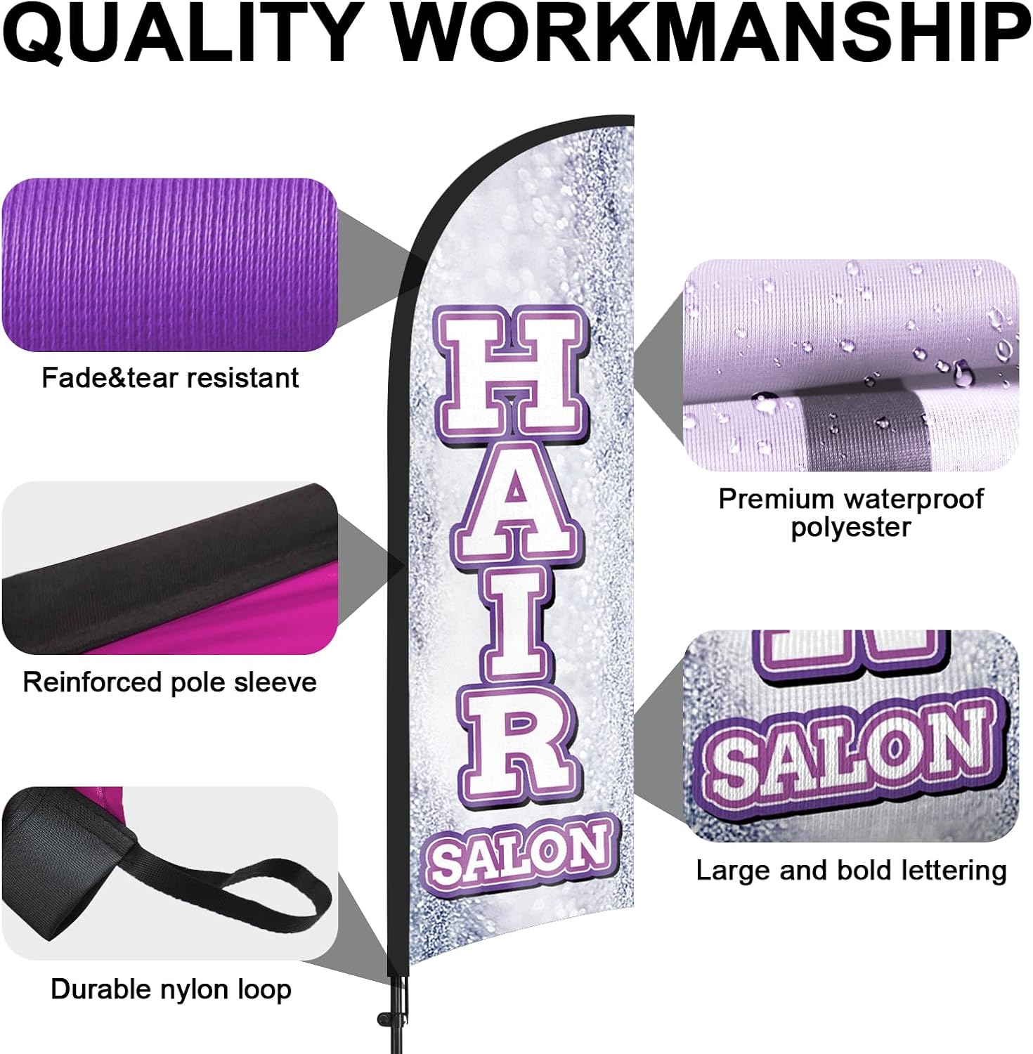 - 【Weather Resistance】These Hair Salon feather flags are designed to withstand various weather conditions, high-quality aluminum and fiberglass pole, tear resistant polyester fabric making it sturdy and heavy-duty to be held up well even in rain, snow, sleet and strong winds.