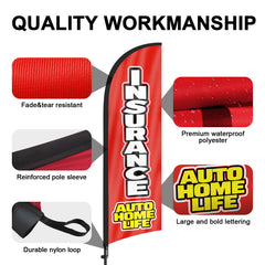 • 【Weather Resistance】These Insurance feather flags are designed to withstand various weather conditions, high-quality aluminum and fiberglass pole, tear resistant polyester fabric making it sturdy and heavy-duty to be held up well even in rain, snow, sleet and strong winds.