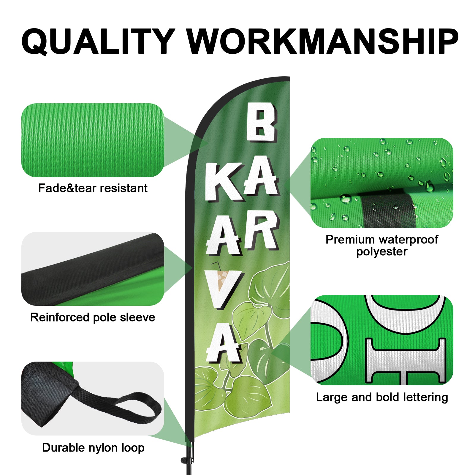 - 【Weather Resistance】These Kava Bar feather flags are designed to withstand various weather conditions, high-quality aluminum and fiberglass pole, tear resistant polyester fabric making it sturdy and heavy-duty to be held up well even in rain, snow, sleet and strong winds.