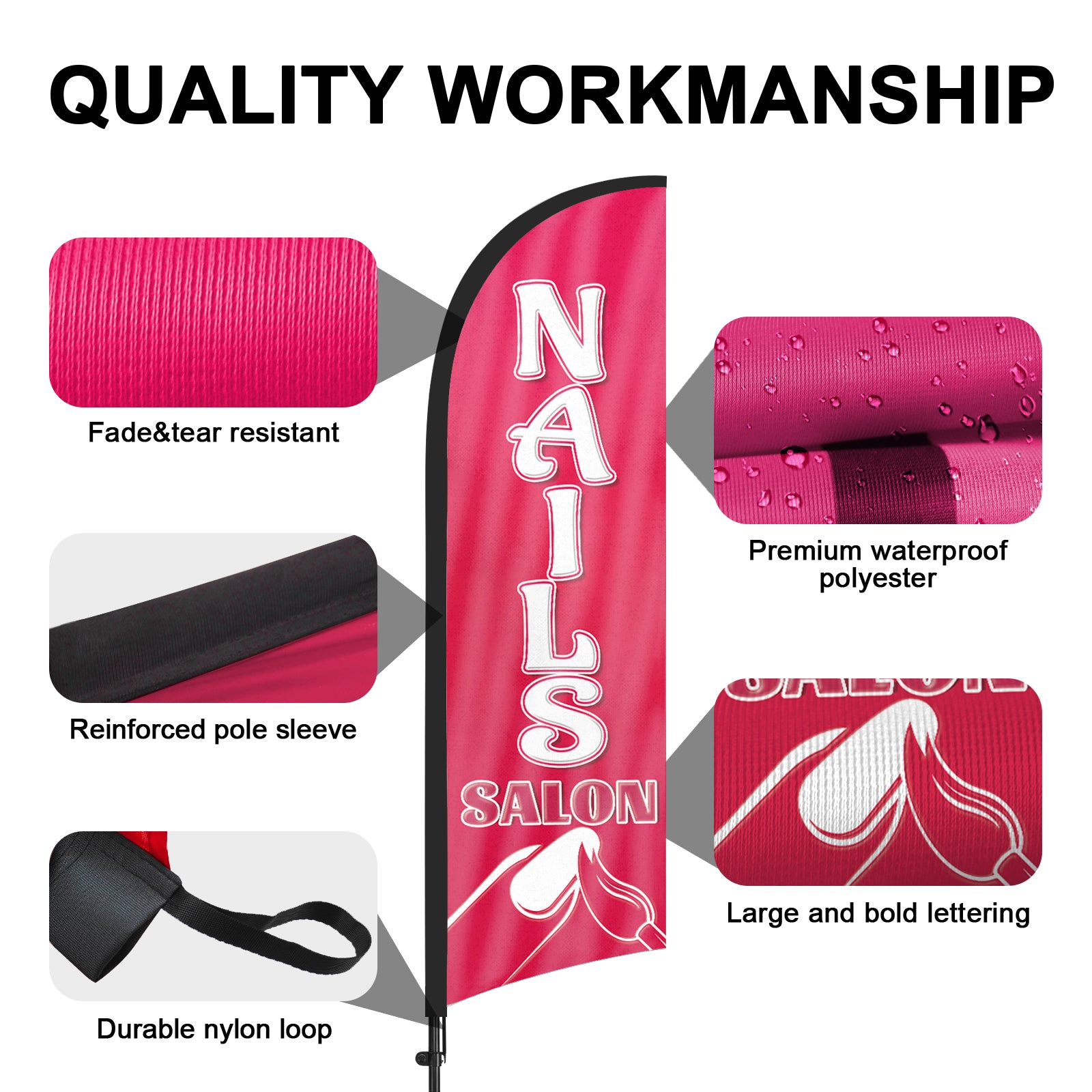 - 【Weather Resistance】These Nails Salon feather flags are designed to withstand various weather conditions, high-quality aluminum and fiberglass pole, tear resistant polyester fabric making it sturdy and heavy-duty to be held up well even in rain, snow, sleet and strong winds.