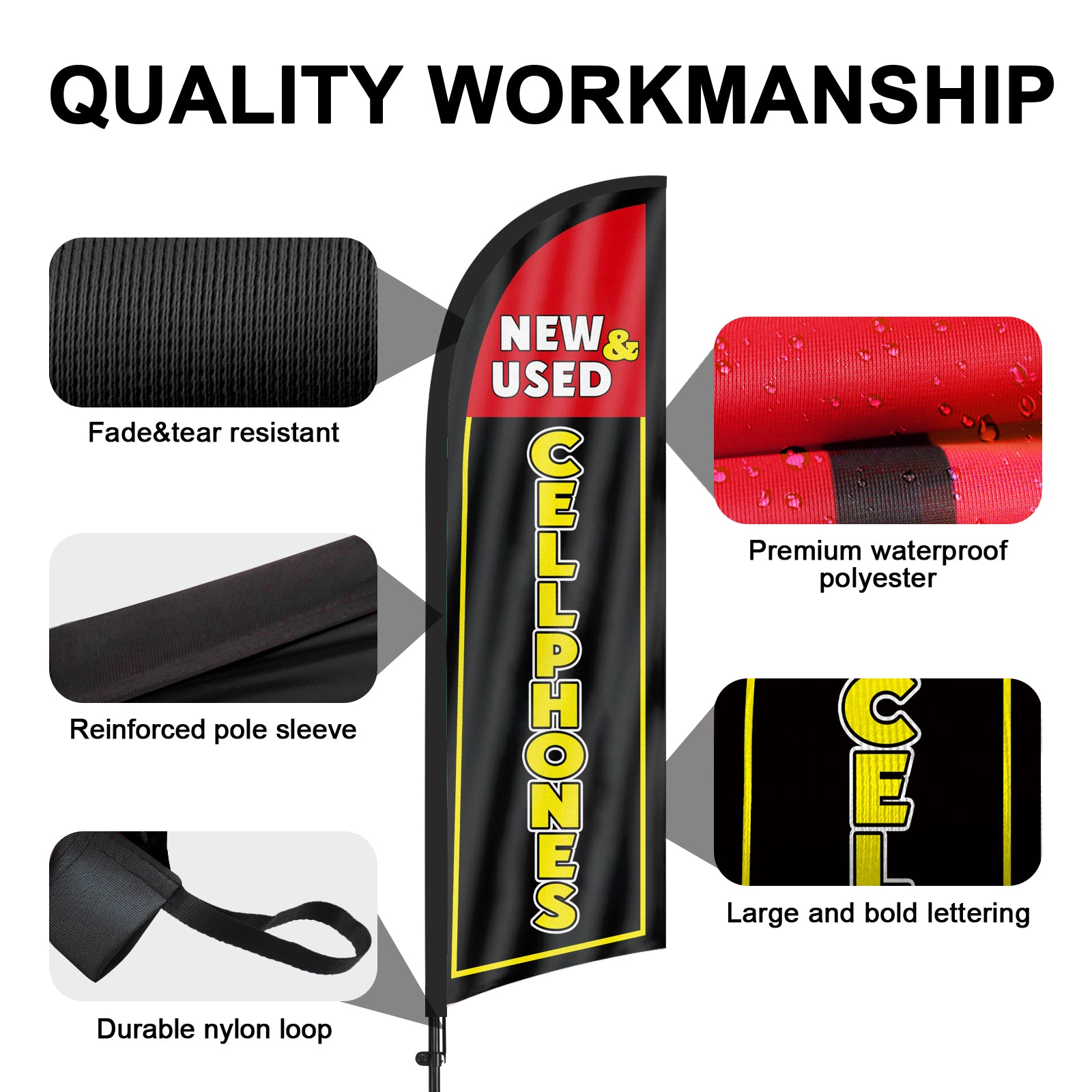 - 【Weather Resistance】These New&Used Cellphones feather flags are designed to withstand various weather conditions, high-quality aluminum and fiberglass pole, tear resistant polyester fabric making it sturdy and heavy-duty to be held up well even in rain, snow, sleet and strong winds.