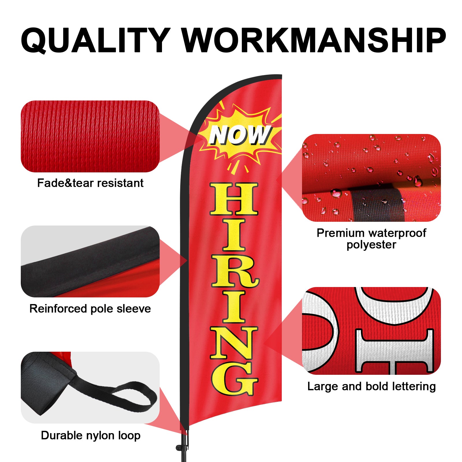 - 【Weather Resistance】These Now Hiring feather flags are designed to withstand various weather conditions, high-quality aluminum and fiberglass pole, tear resistant polyester fabric making it sturdy and heavy-duty to be held up well even in rain, snow, sleet and strong winds.