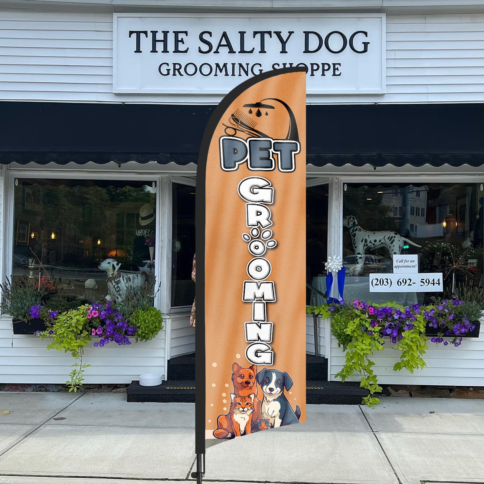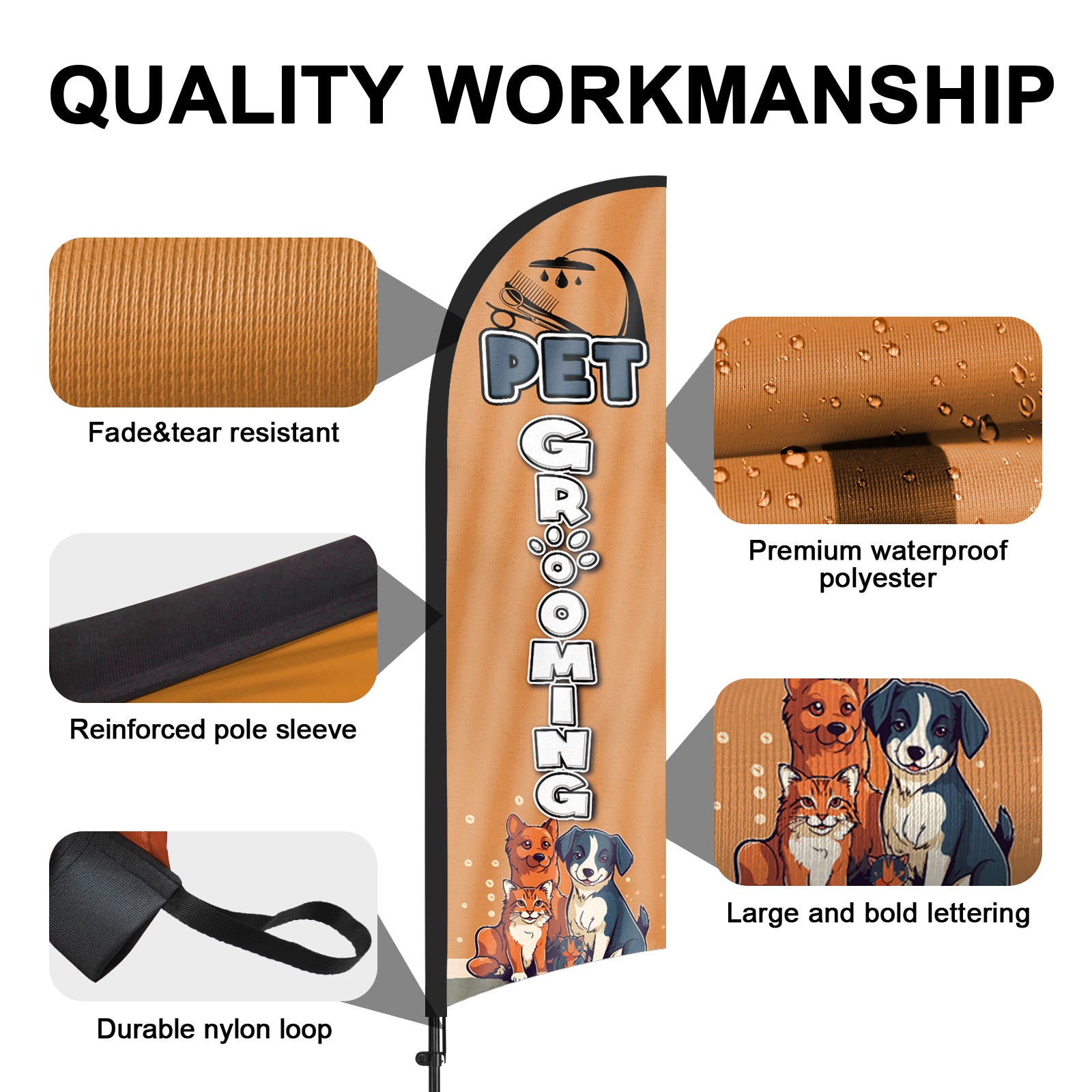 - 【Weather Resistance】These Pet Grooming feather flags are designed to withstand various weather conditions, high-quality aluminum and fiberglass pole, tear resistant polyester fabric making it sturdy and heavy-duty to be held up well even in rain, snow, sleet and strong winds.