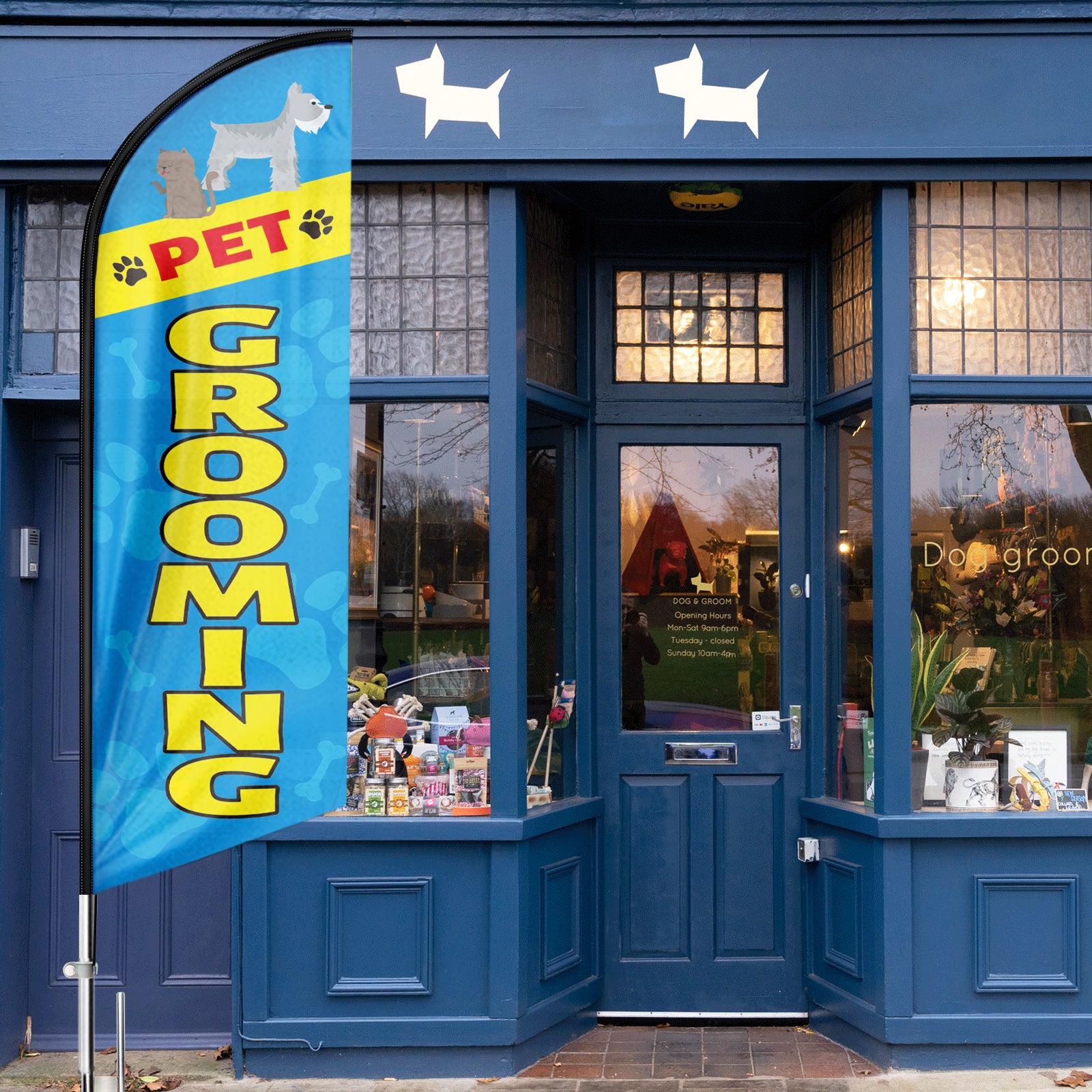 - 【Cost-effective】A must-have and cost-effective way to increase traffic to business. Put the stake in the ground or other stand bases to display the Pet Grooming flag sign daily.