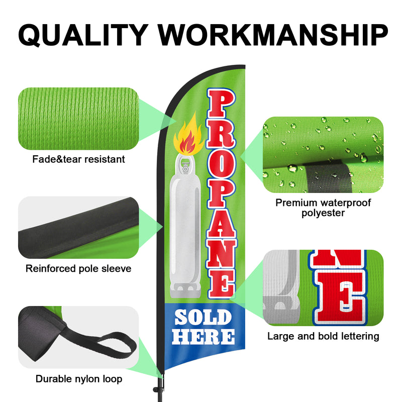 - 【Weather Resistance】These Propane Sold Here feather flags are designed to withstand various weather conditions, high-quality aluminum and fiberglass pole, tear resistant polyester fabric making it sturdy and heavy-duty to be held up well even in rain, snow, sleet and strong winds.