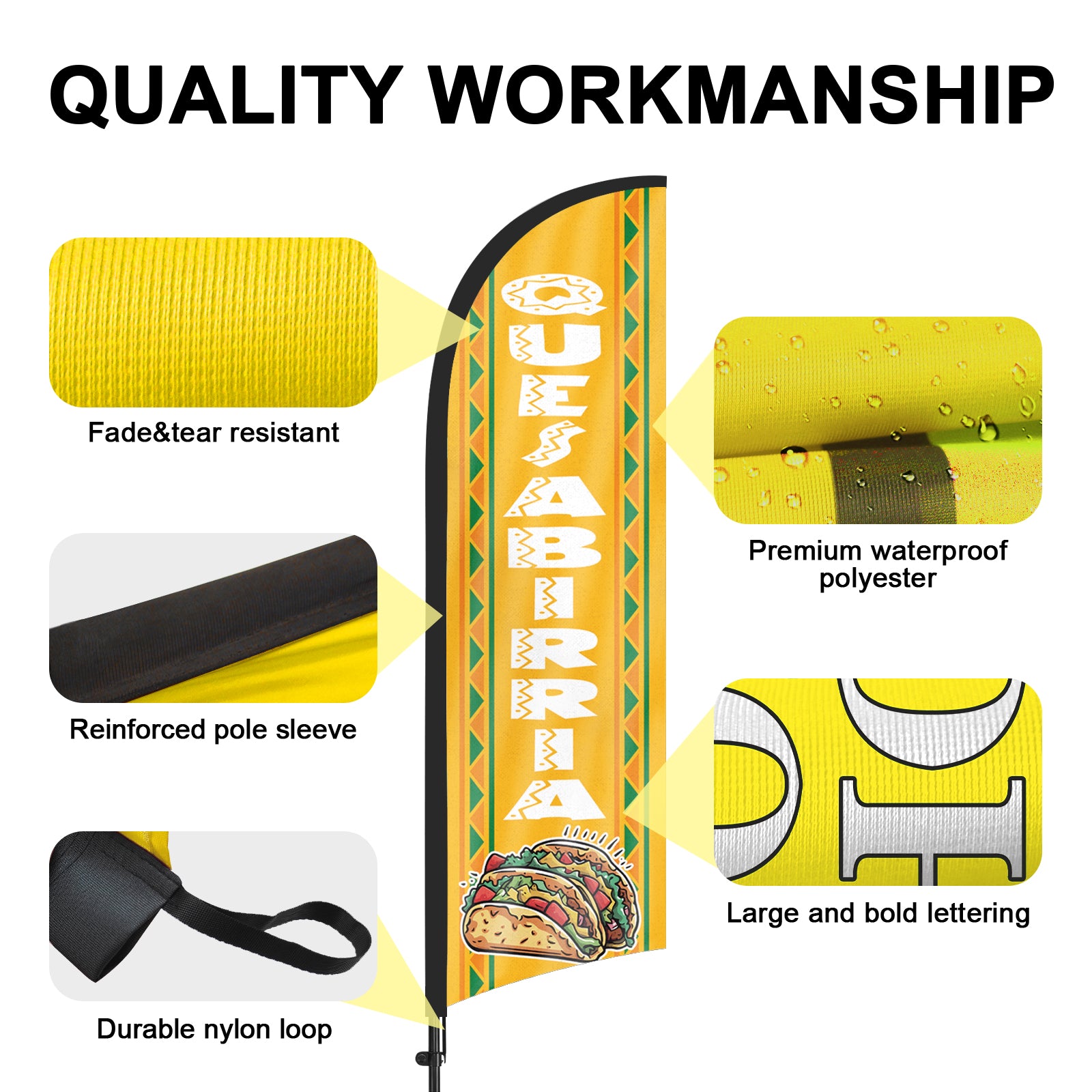 - 【Weather Resistance】These Quesabirria feather flags are designed to withstand various weather conditions, high-quality aluminum and fiberglass pole, tear resistant polyester fabric making it sturdy and heavy-duty to be held up well even in rain, snow, sleet and strong winds.