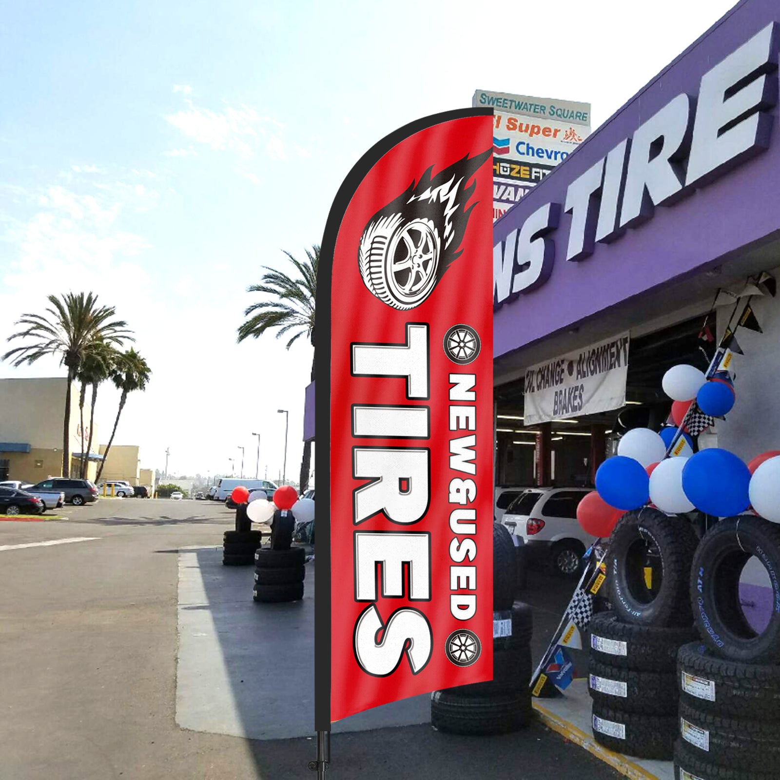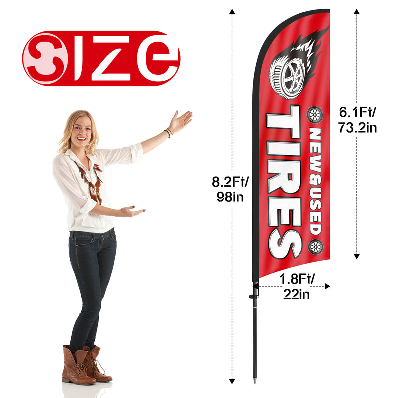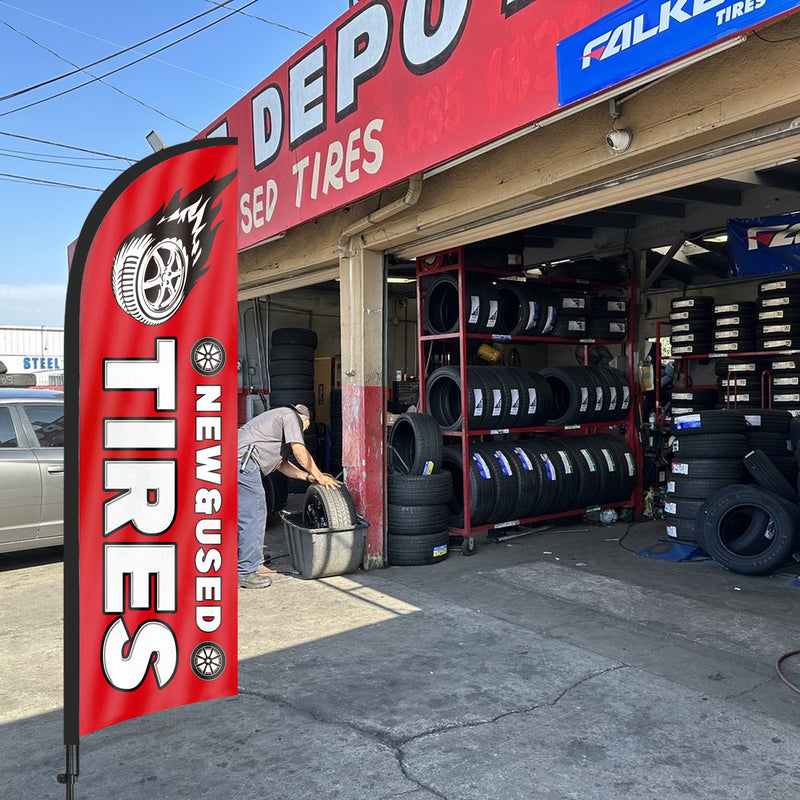 - 【Attention-Grabbing】New&Used Tires feather flags stand tall and sway with the wind, making them highly visible and attention-grabbing. The New&Used Tires flags’ unique shape and vibrant colors make them stand out in crowded environments, attracting many potential customers from a distance.