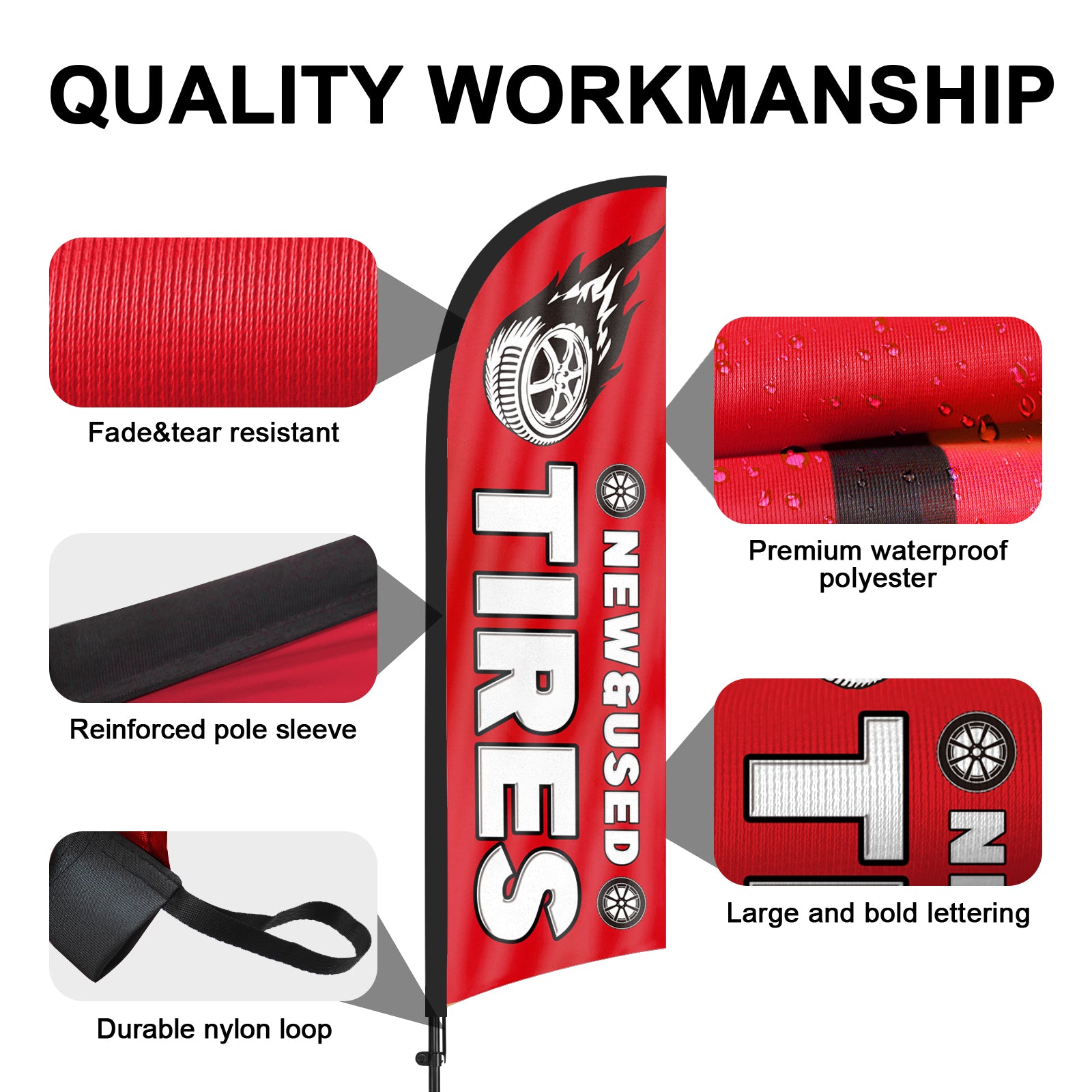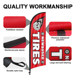 - 【Weather Resistance】These New&Used Tires feather flags are designed to withstand various weather conditions, high-quality aluminum and fiberglass pole, tear resistant polyester fabric making it sturdy and heavy-duty to be held up well even in rain, snow, sleet and strong winds.