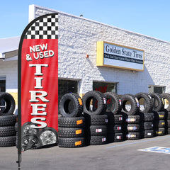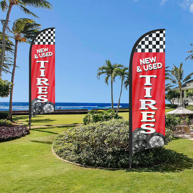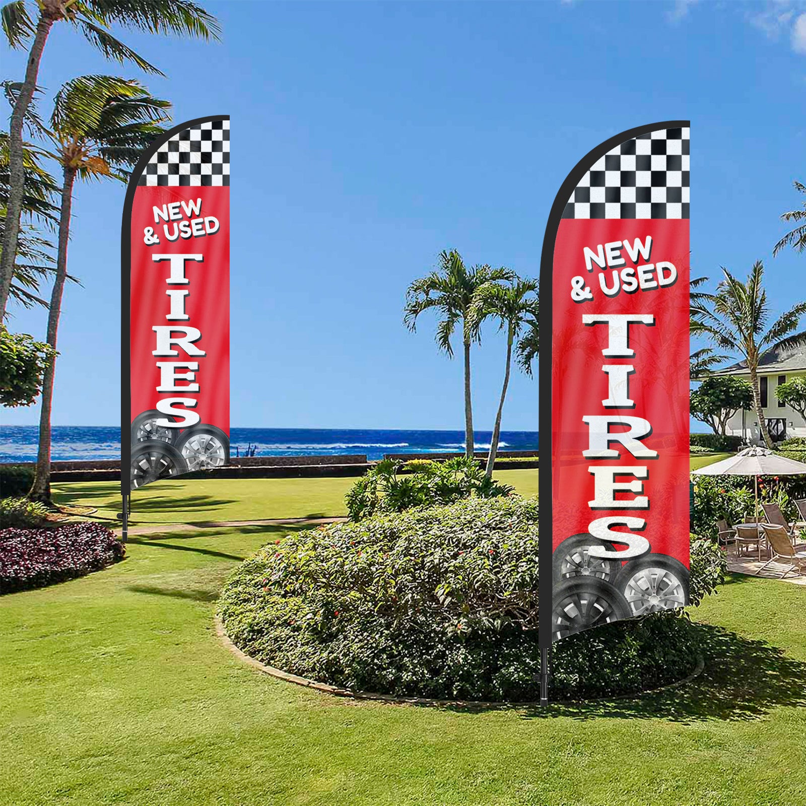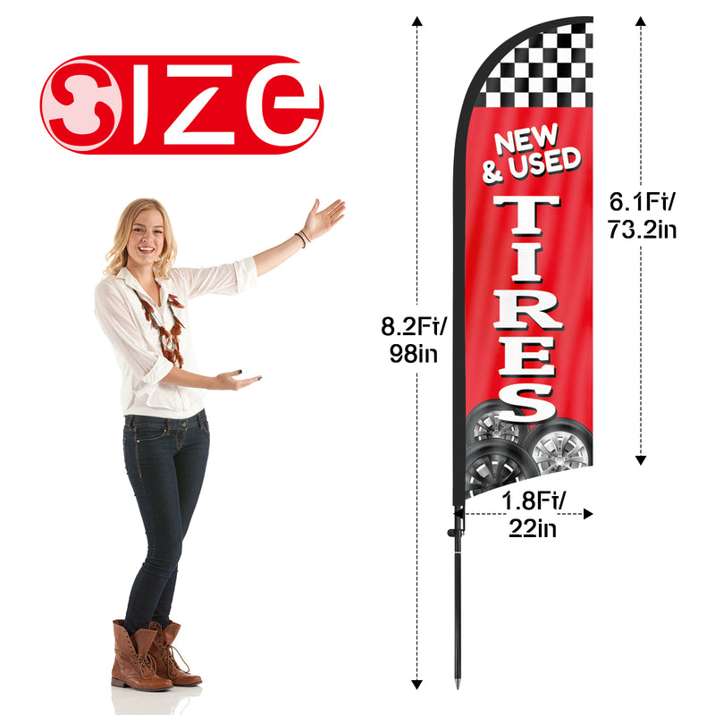 - 【Attention-Grabbing】New&Used Tires feather flags stand tall and sway with the wind, making them highly visible and attention-grabbing. The New&Used Tires flags’ unique shape and vibrant colors make them stand out in crowded environments, attracting many potential customers from a distance.