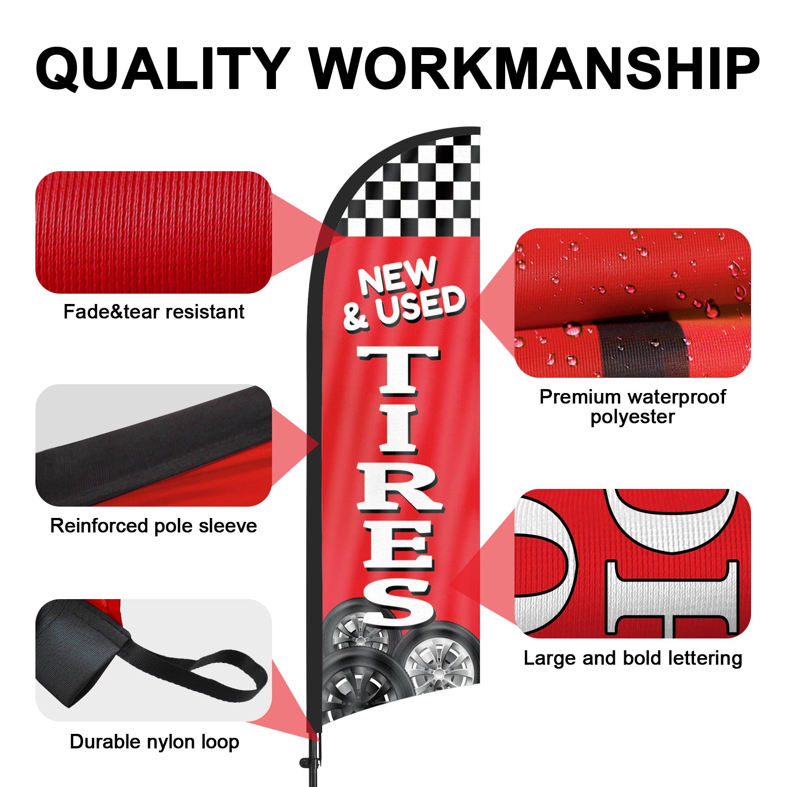 - 【Weather Resistance】These New&Used Tires feather flags are designed to withstand various weather conditions, high-quality aluminum and fiberglass pole, tear resistant polyester fabric making it sturdy and heavy-duty to be held up well even in rain, snow, sleet and strong winds.