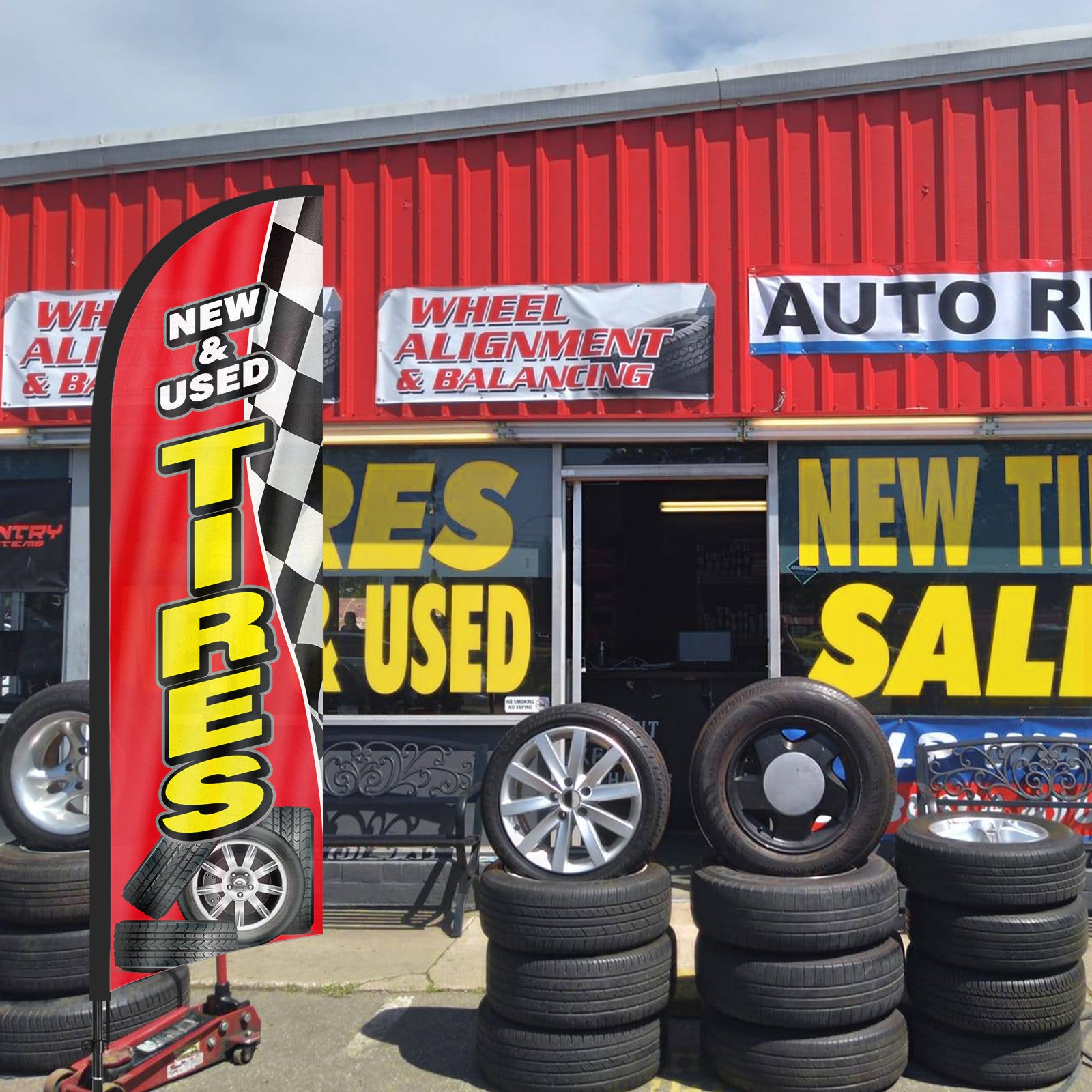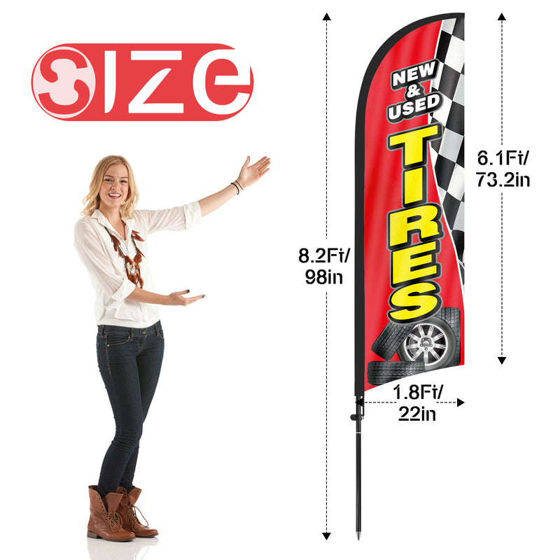- 【Attention-Grabbing】New&Used Tires feather flags stand tall and sway with the wind, making them highly visible and attention-grabbing. The New&Used Tires flags’ unique shape and vibrant colors make them stand out in crowded environments, attracting many potential customers from a distance.