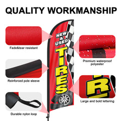- 【Weather Resistance】These New&Used Tires feather flags are designed to withstand various weather conditions, high-quality aluminum and fiberglass pole, tear resistant polyester fabric making it sturdy and heavy-duty to be held up well even in rain, snow, sleet and strong winds.
