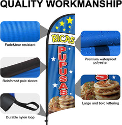 - 【Portable and Easy Setup】This Ricas Pupusas feather flag pole kit includes 1 swooper flag+6 rods+1 ground stake and comes with 1 storage bag. They can be quickly set up and taken down, requiring minimal effort.