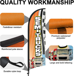 - 【Weather Resistance】These Semitrucks feather flags are designed to withstand various weather conditions, high-quality aluminum and fiberglass pole, tear resistant polyester fabric making it sturdy and heavy-duty to be held up well even in rain, snow, sleet and strong winds.