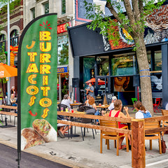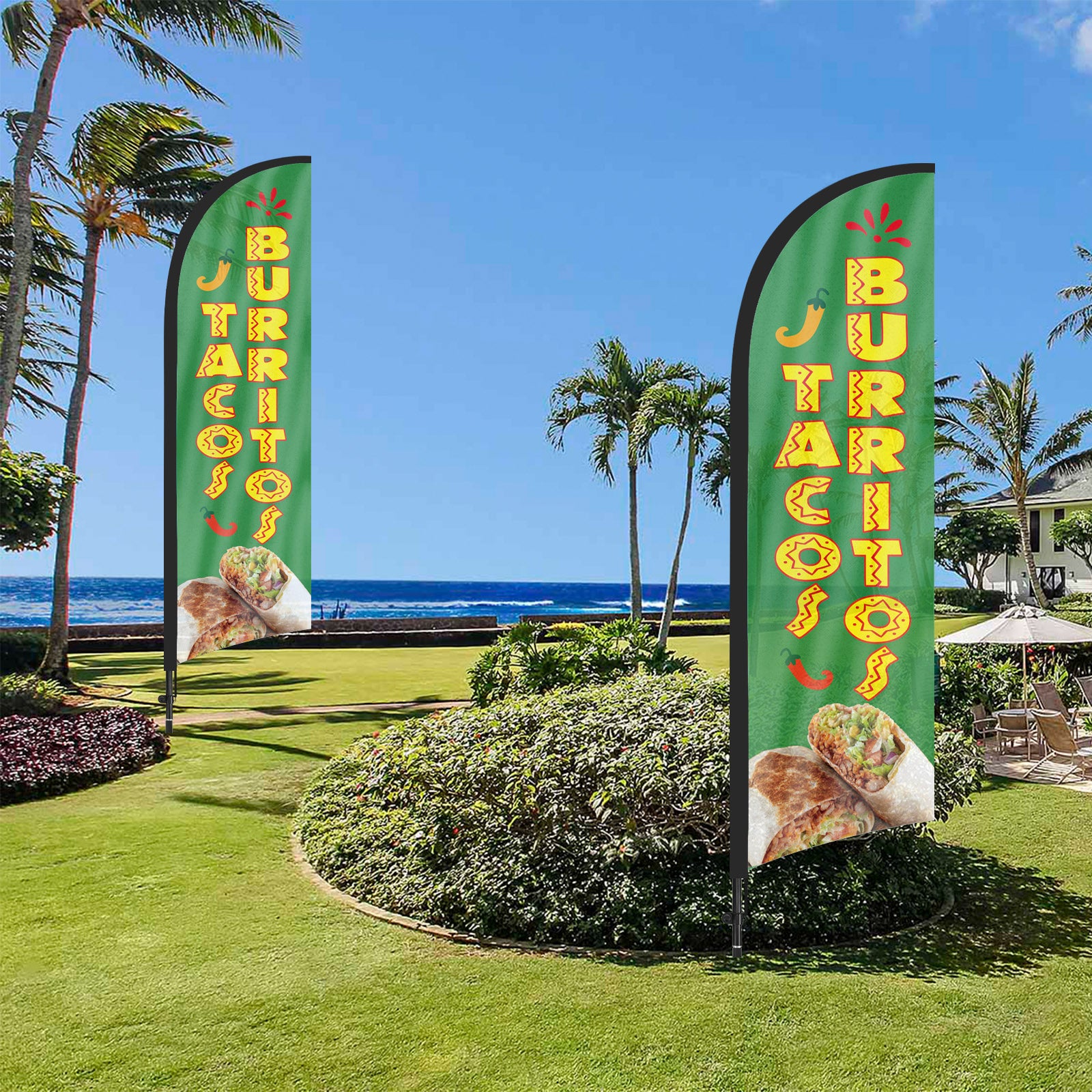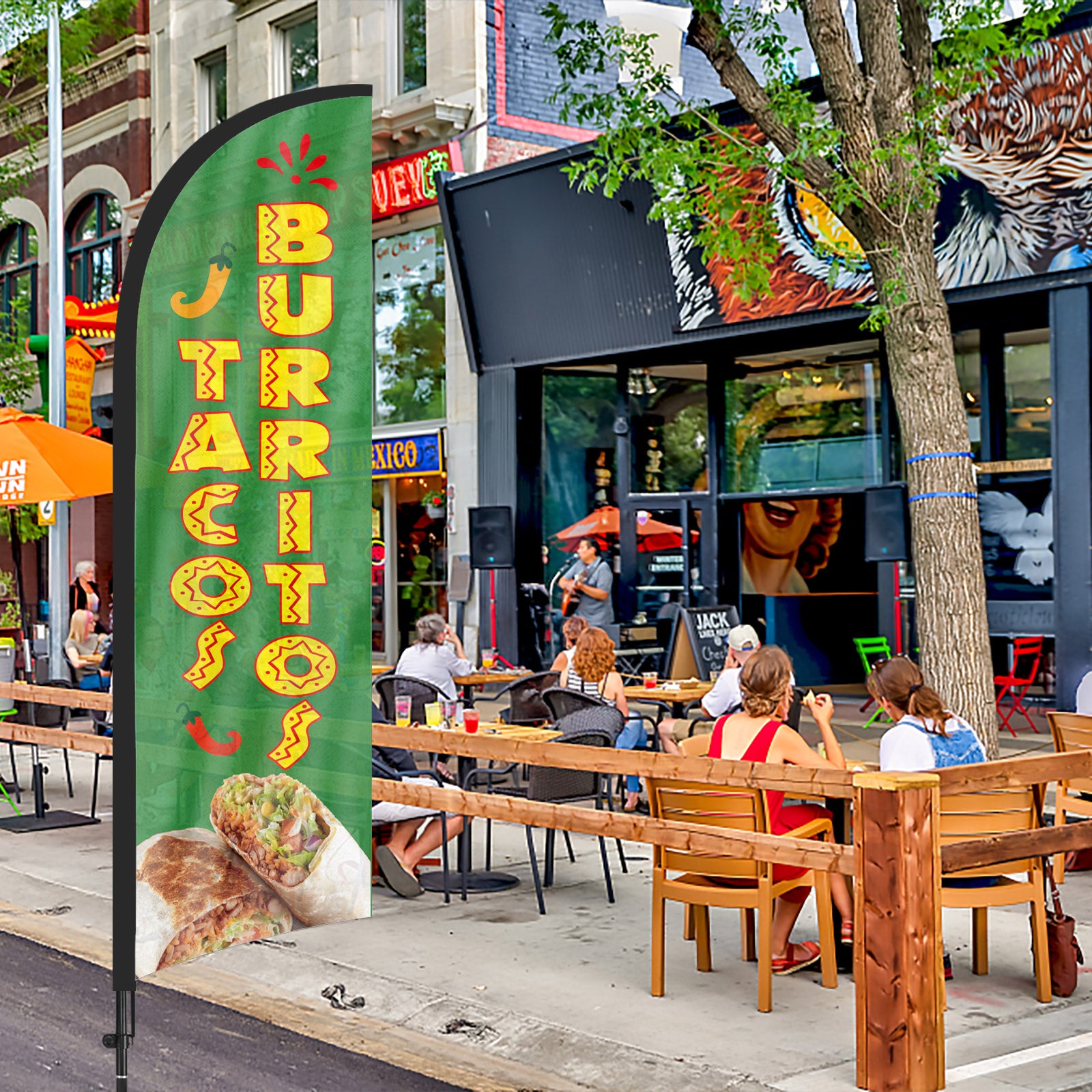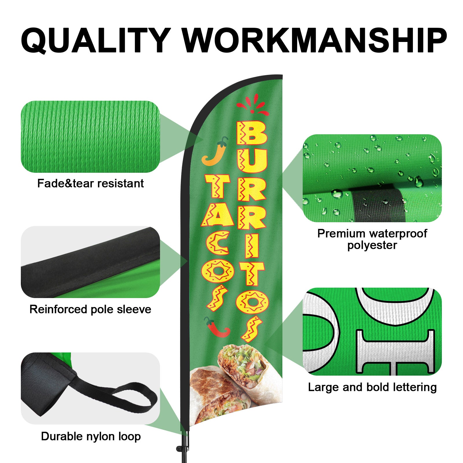 - 【Attention-Grabbing】Tacos Burritos feather flags stand tall and sway with the wind, making them highly visible and attention-grabbing. The Tacos Burritos flags’ unique shape and vibrant colors make them stand out in crowded environments, attracting many potential customers from a distance.