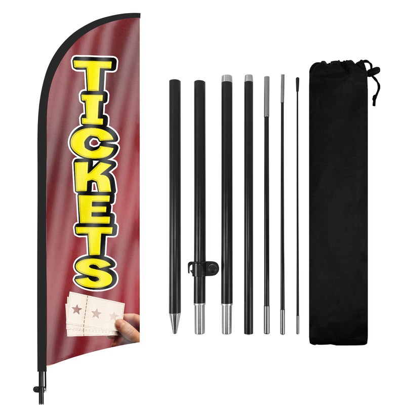 - 【Portable and Easy Setup】This Tickets feather flag pole kit includes 1 swooper flag+6 rods+1 ground stake and comes with 1 carry bag. They can be quickly set up and taken down, requiring minimal effort.