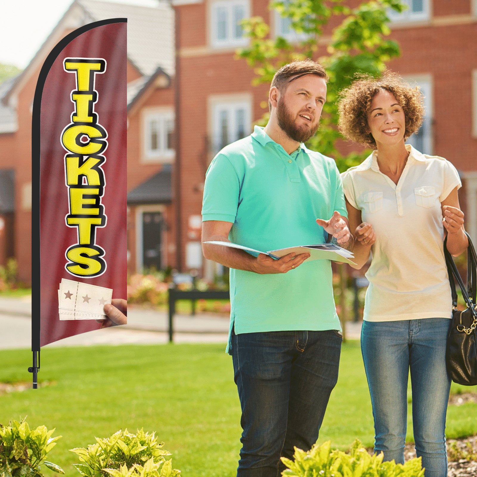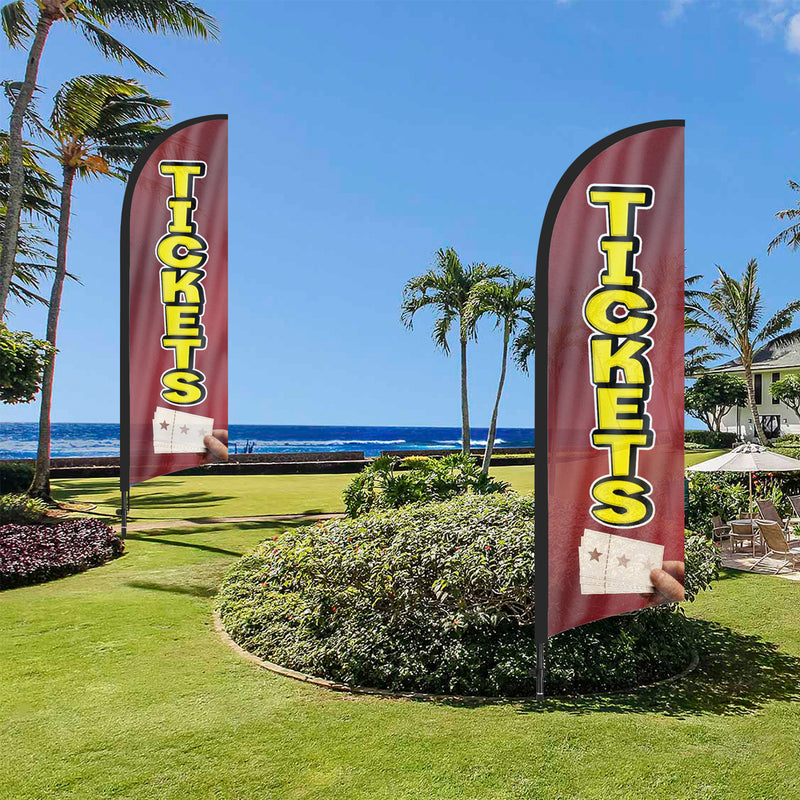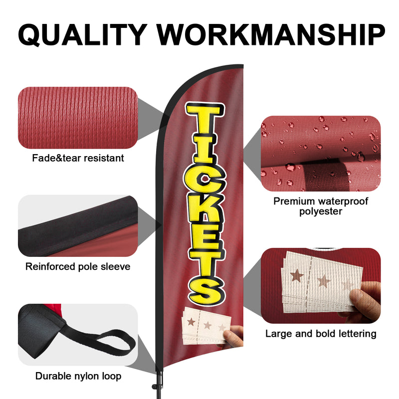 - 【Attention-Grabbing】Tickets feather flags stand tall and sway with the wind, making them highly visible and attention-grabbing. The Tickets flags’ unique shape and vibrant colors make them stand out in crowded environments, attracting many potential customers from a distance.