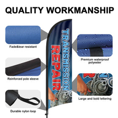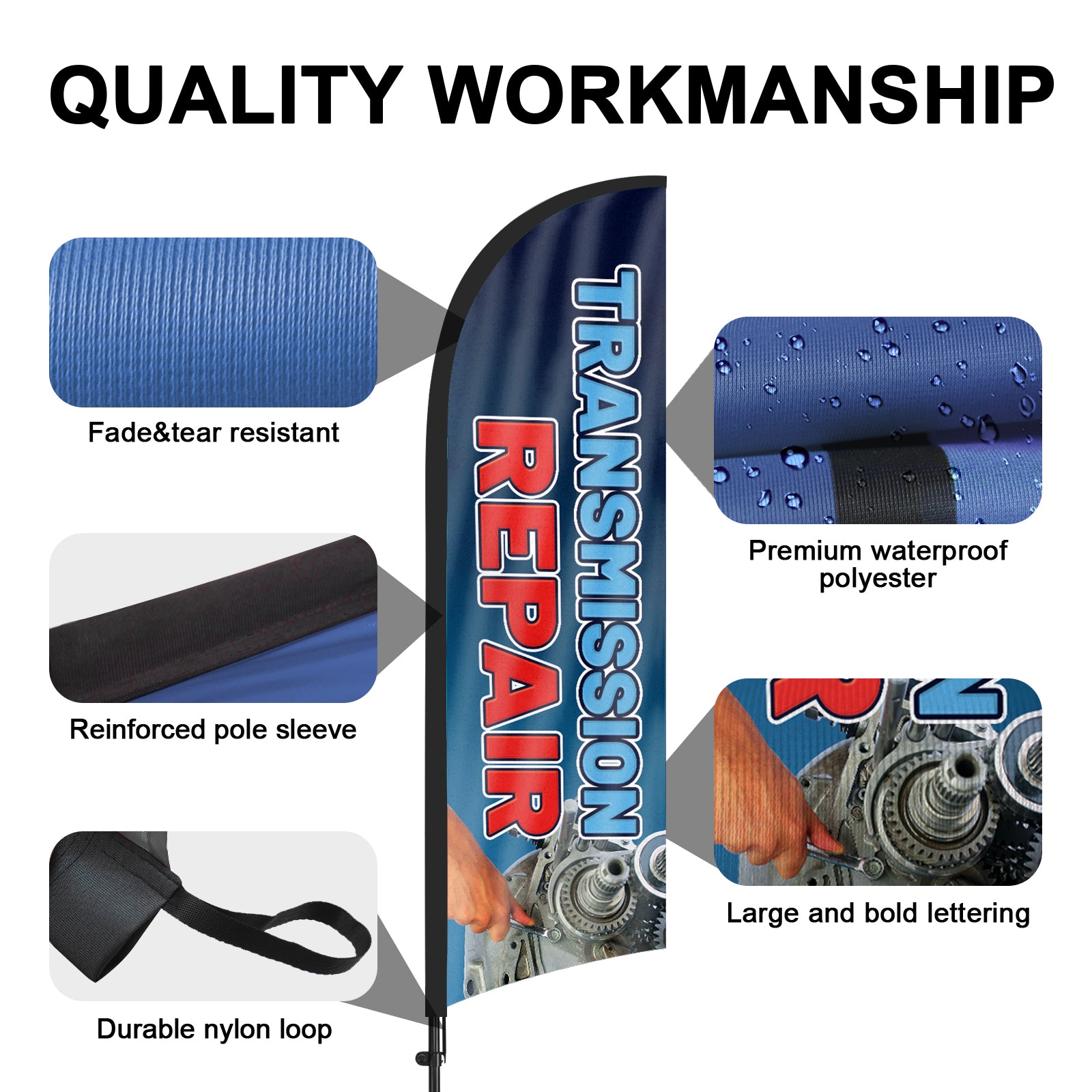 - 【Weather Resistance】These Transmission Repair feather flags are designed to withstand various weather conditions, high-quality aluminum and fiberglass pole, tear resistant polyester fabric making it sturdy and heavy-duty to be held up well even in rain, snow, sleet and strong winds.