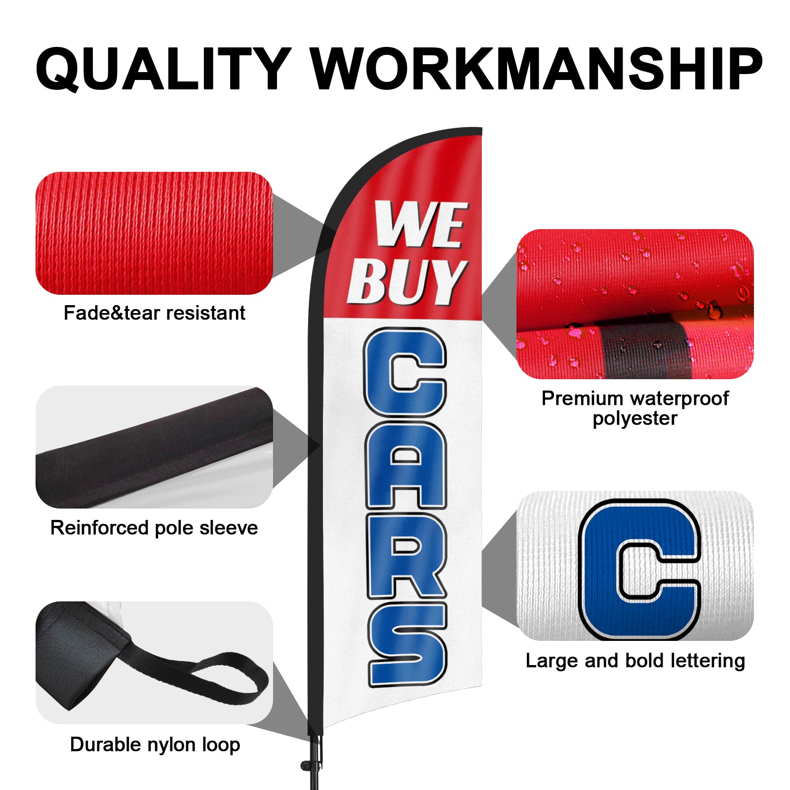 - 【Weather Resistance】These We Buy Cars feather flags are designed to withstand various weather conditions, high-quality aluminum and fiberglass pole, tear resistant polyester fabric making it sturdy and heavy-duty to be held up well even in rain, snow, sleet and strong winds.