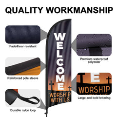 - 【Weather Resistance】These Welcome Worship with Us feather flags are designed to withstand various weather conditions, high-quality aluminum and fiberglass pole, tear resistant polyester fabric making it sturdy and heavy-duty to be held up well even in rain, snow, sleet and strong winds.