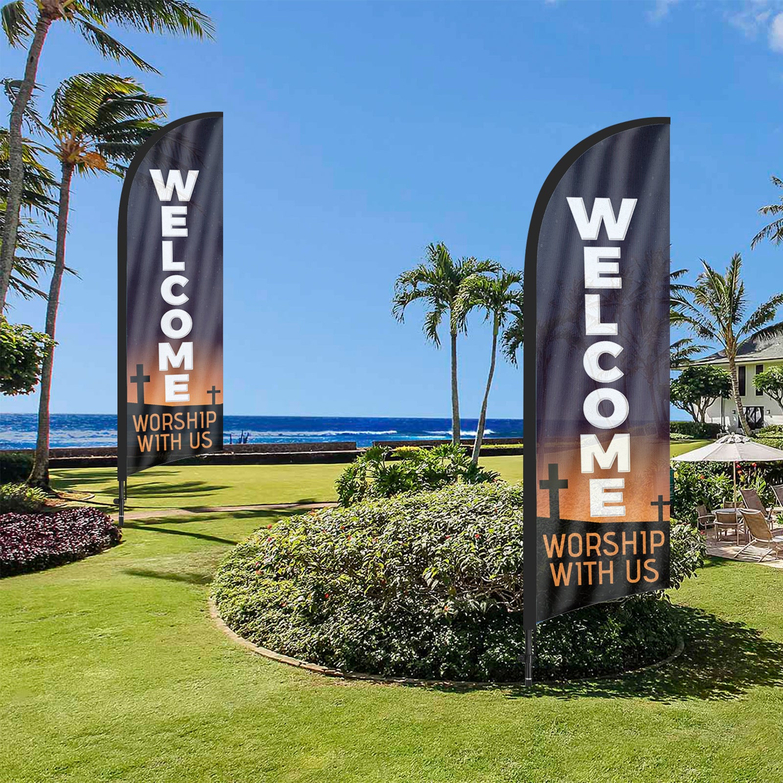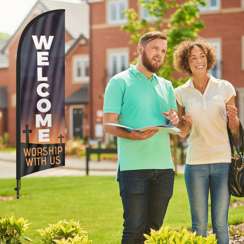 - 【Portable and Easy Setup】This Welcome Worship with Us feather flag pole kit includes 1 swooper flag+6 rods+1 ground stake and comes with 1 carry bag. They can be quickly set up and taken down, requiring minimal effort.