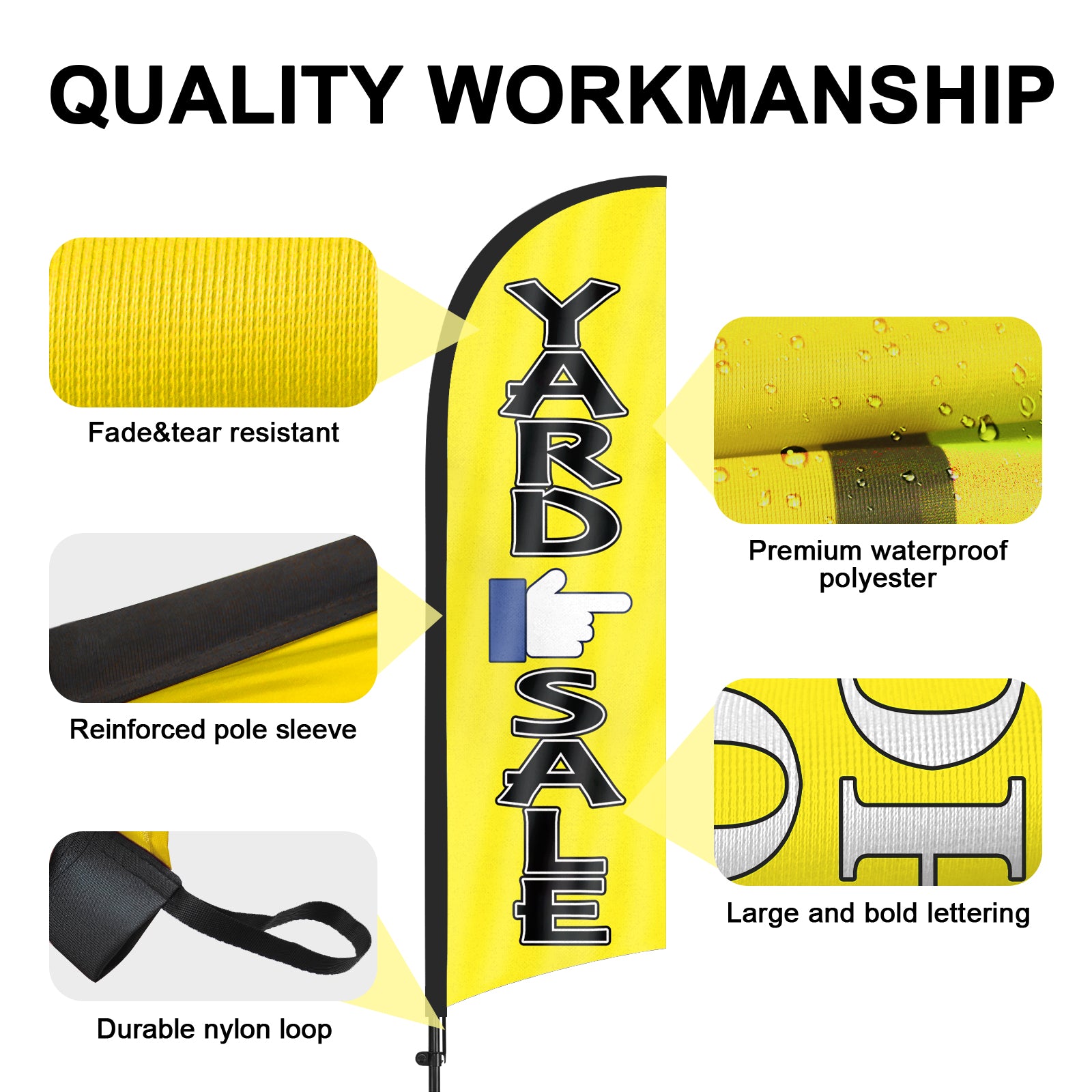 - 【Weather Resistance】These Yard Sale feather flags are designed to withstand various weather conditions, high-quality aluminum and fiberglass pole, tear resistant polyester fabric making it sturdy and heavy-duty to be held up well even in rain, snow, sleet and strong winds.