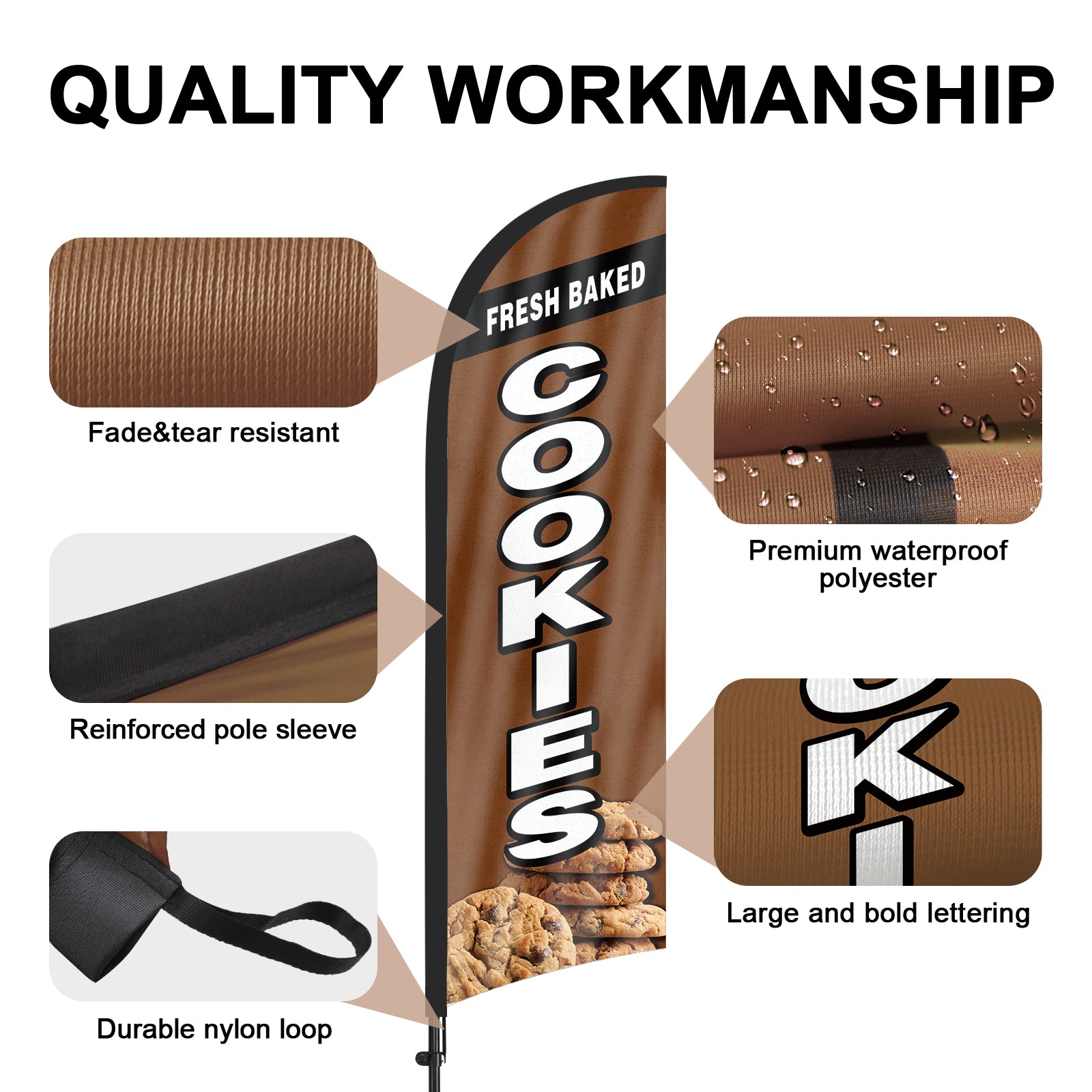 - 【Weather Resistance】These Fresh Baked Cookies feather flags are designed to withstand various weather conditions, high-quality aluminum and fiberglass pole, tear resistant polyester fabric making it sturdy and heavy-duty to be held up well even in rain, snow, sleet and strong winds.