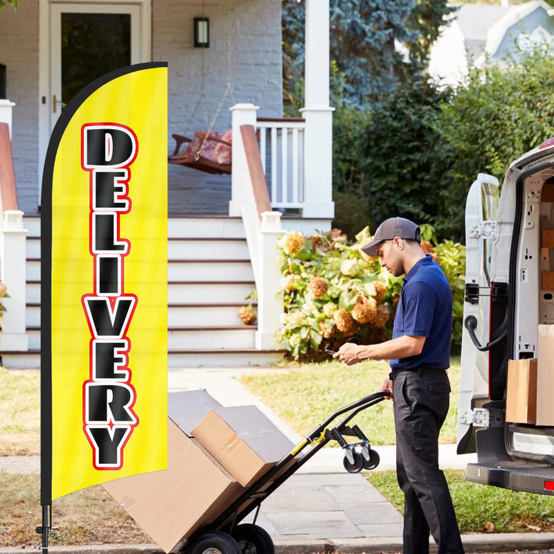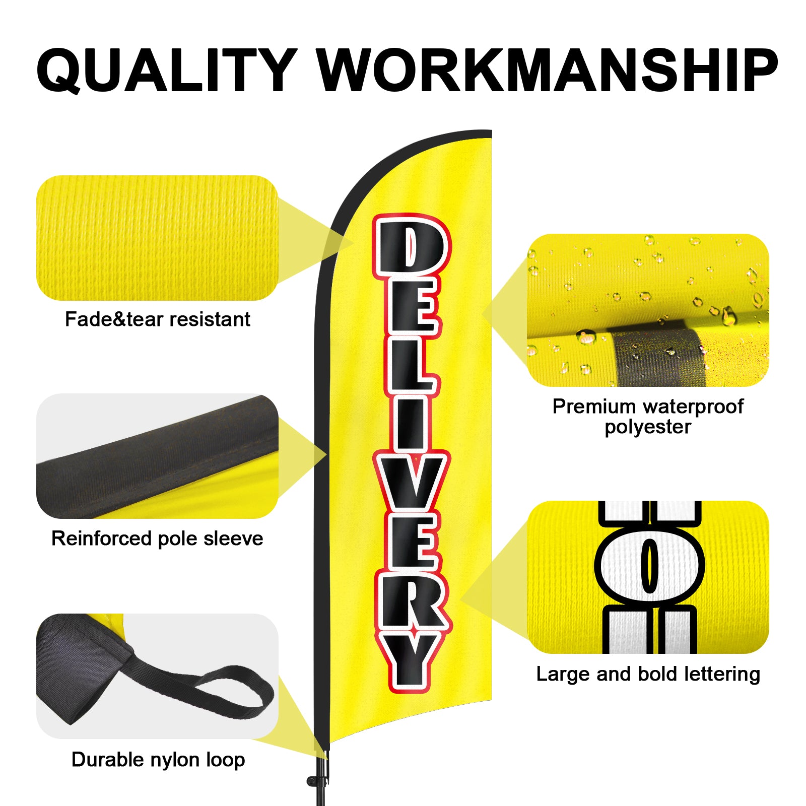 - 【Cost-Effective Advertising】The Delivery sign offer a cost-effective advertising solution compared to other traditional forms of outdoor advertising. This Delivery flag size is (8.2ft/98in) tall and (1.8ft/22in) wide, visible enough from far away, ensures your business stands out from the crowd, grabbing attention and increasing foot traffic.