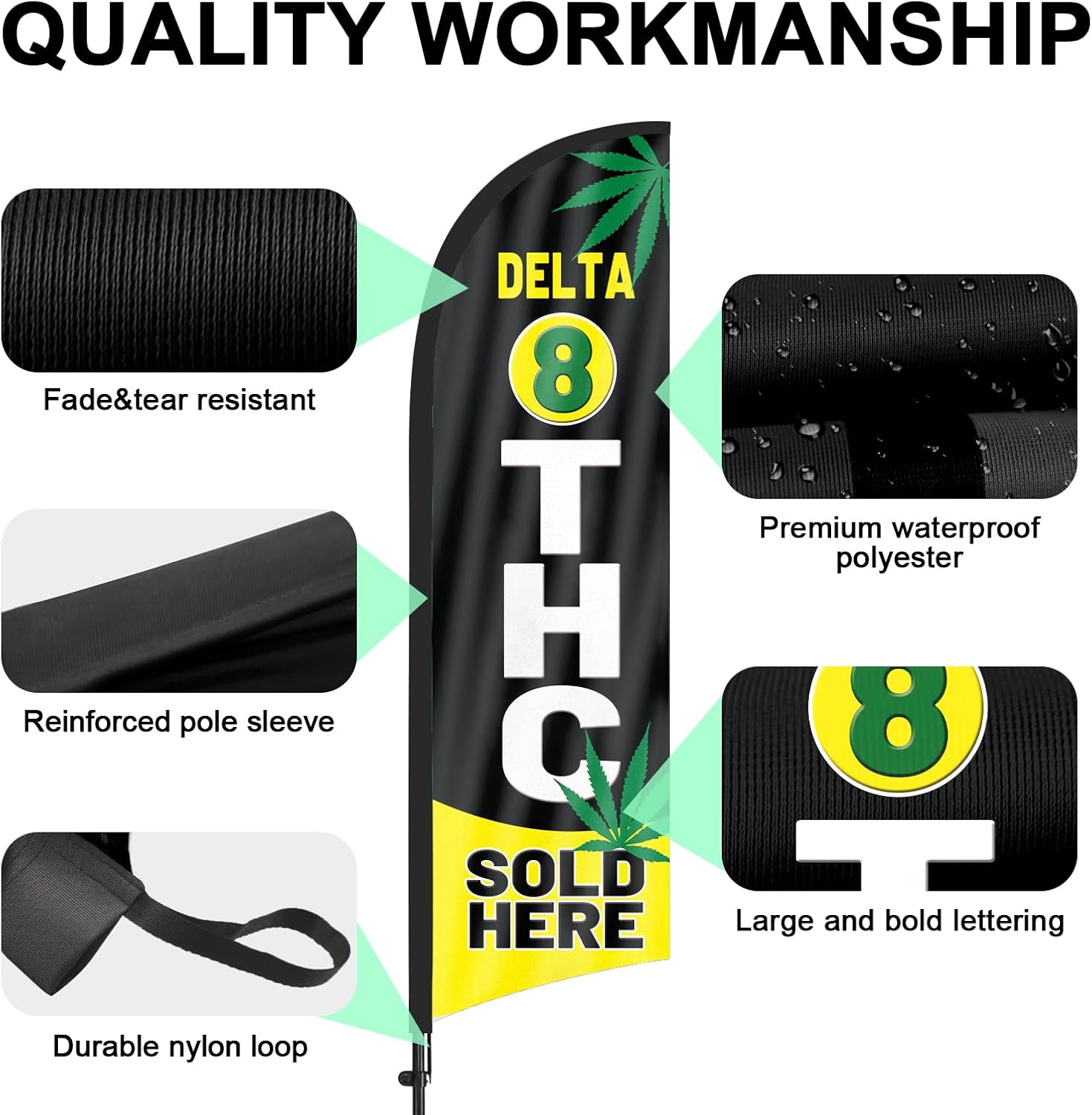- 【Weather Resistance】These Delta 8 Sold Here feather flags are designed to withstand various weather conditions, high-quality aluminum and fiberglass pole, tear resistant polyester fabric making it sturdy and heavy-duty to be held up well even in rain, snow, sleet and strong winds.