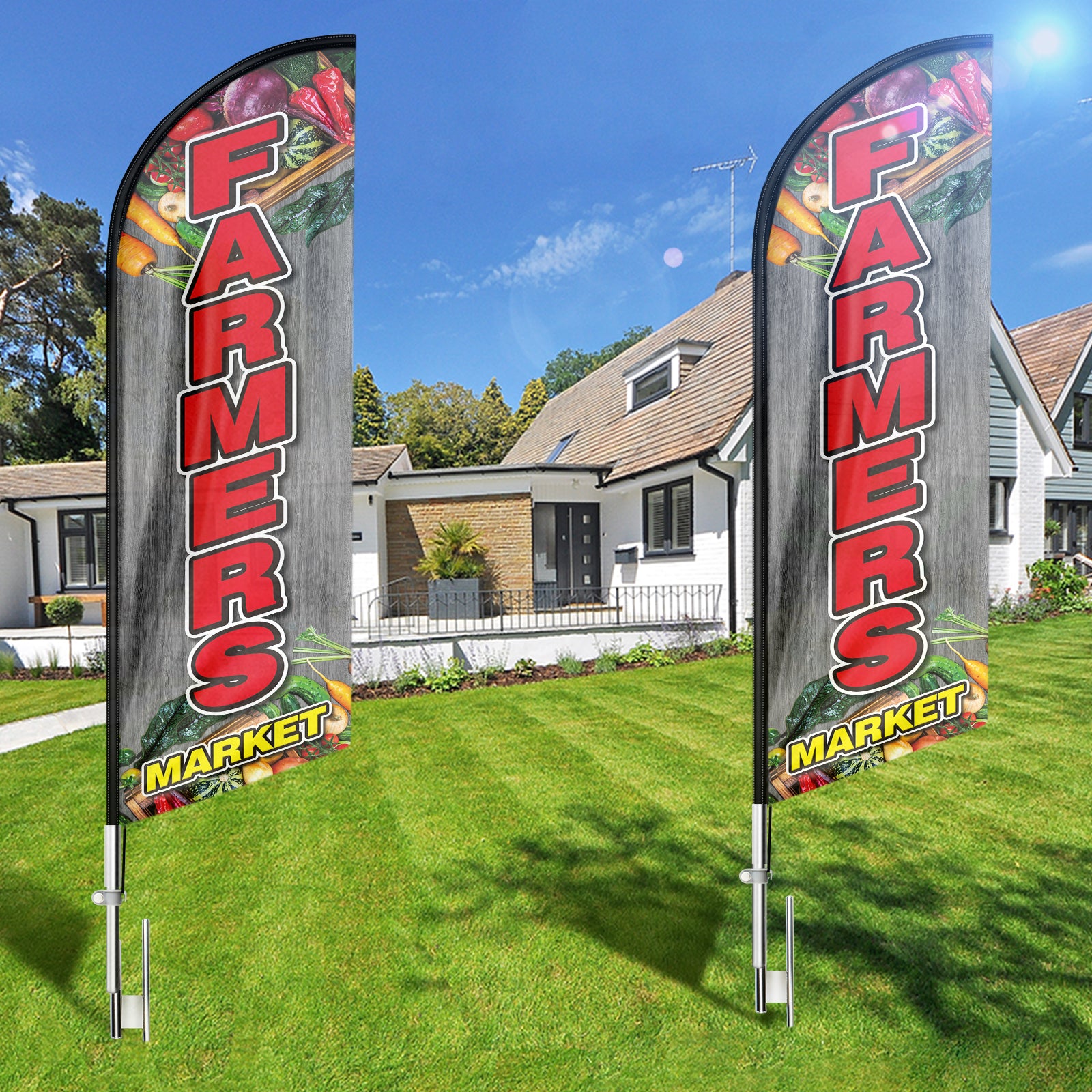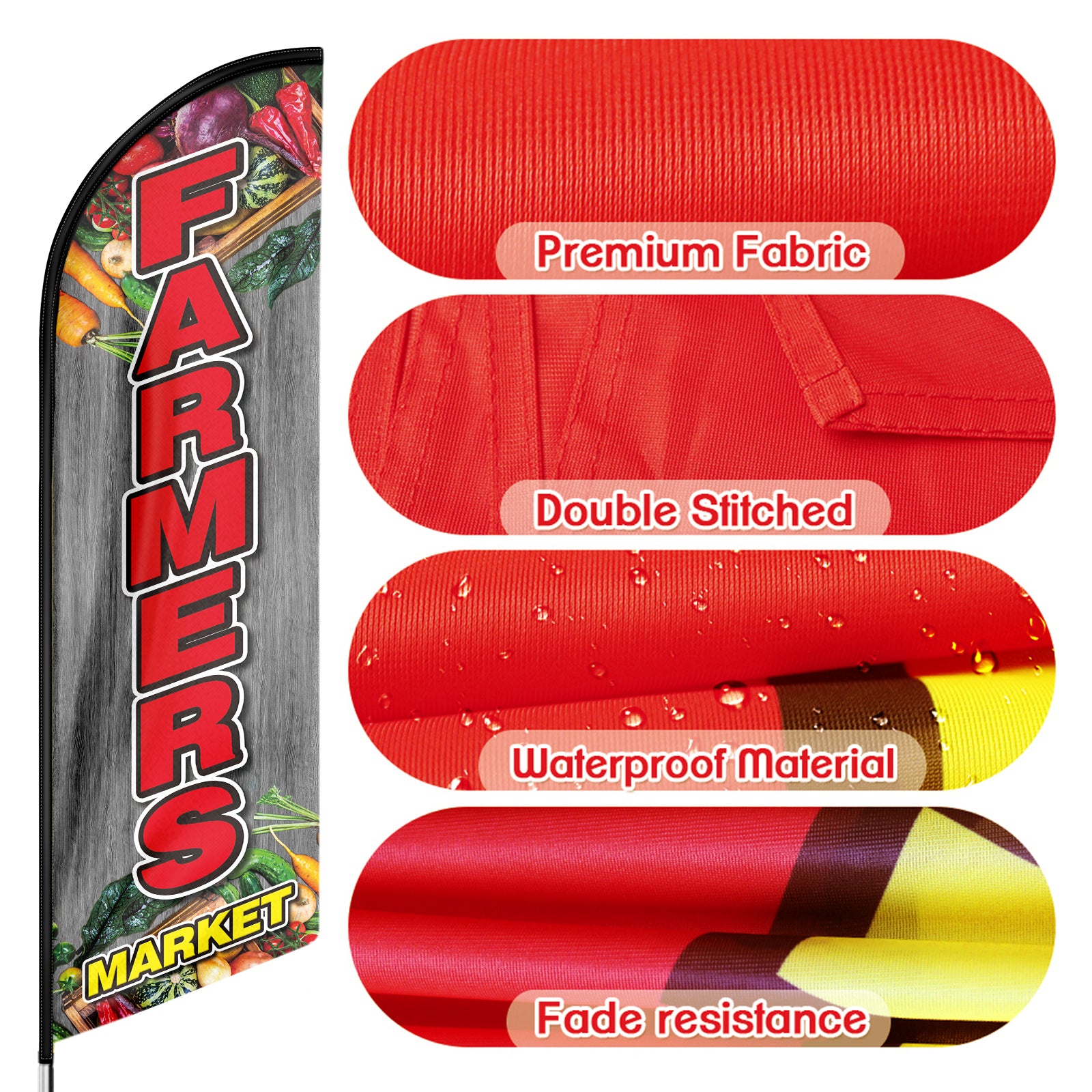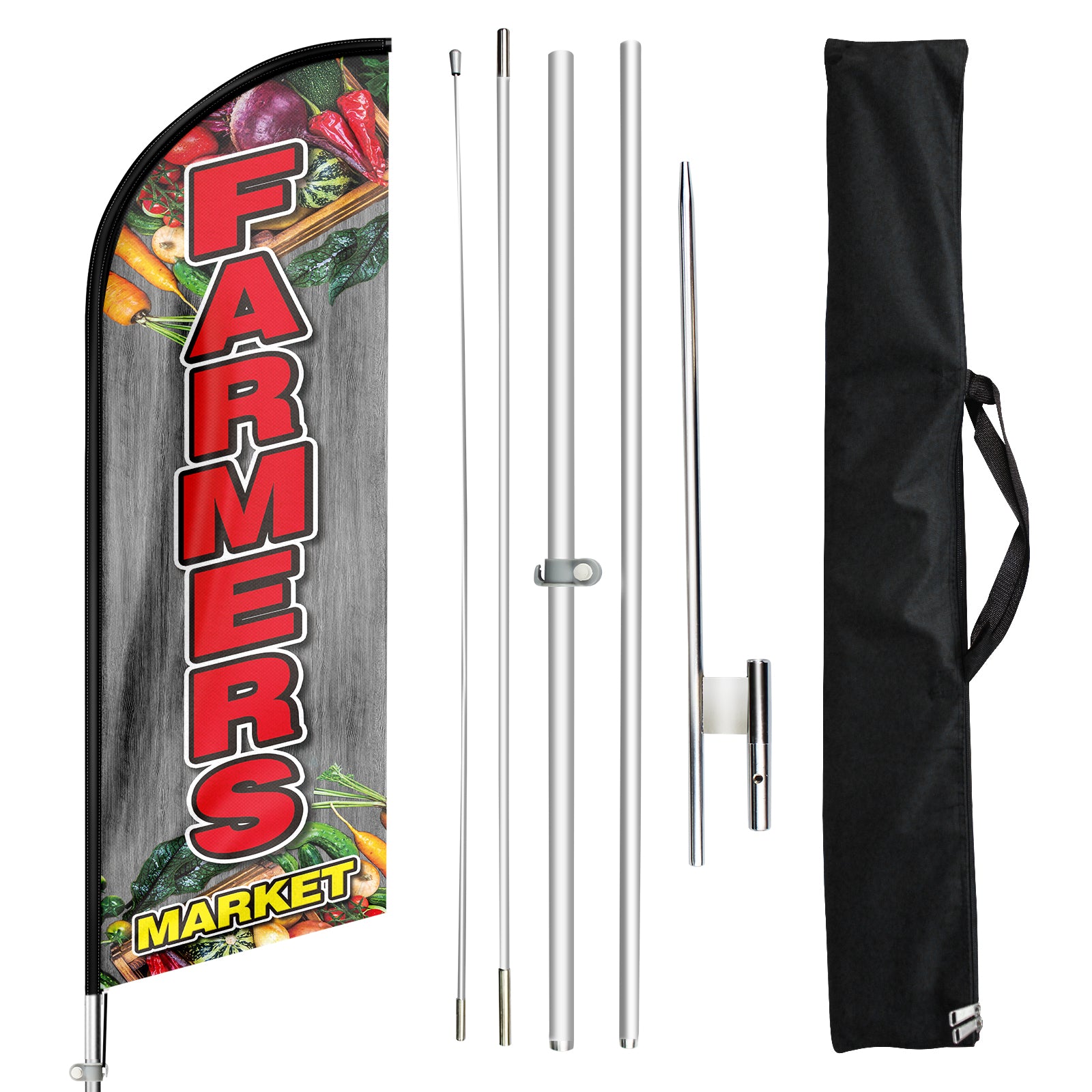 - 🏠【Easy To Assemble and Disassemble】This Farmers Market feather flag pole kit includes 1 swooper flag+4 flagpoles+1 ground stake and comes with 1 carry bag. Just snap the pieces together and put the stake in the ground or other stand bases to display the business sign daily and it is portable and easy to pack with the carrying bag when the feather flag pole kit disassembled.