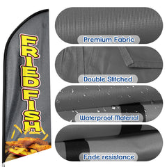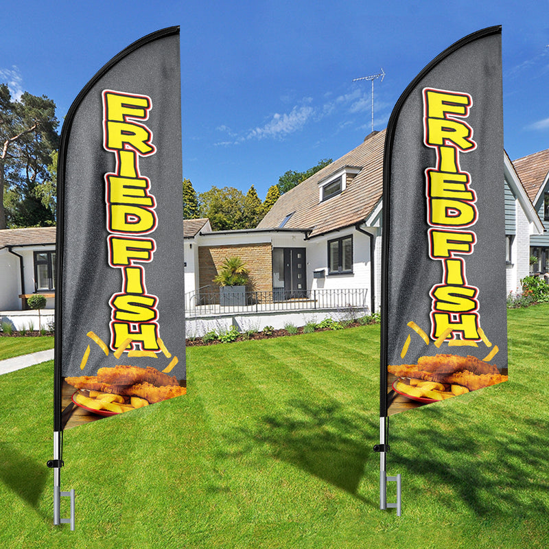 🏠 Constructed with high-quality aluminum poles and tear-resistant polyester fabric, our Fried Fish feather banners stand strong against various weather conditions, ensuring your fry fest at Six Flags remains visible and memorable.